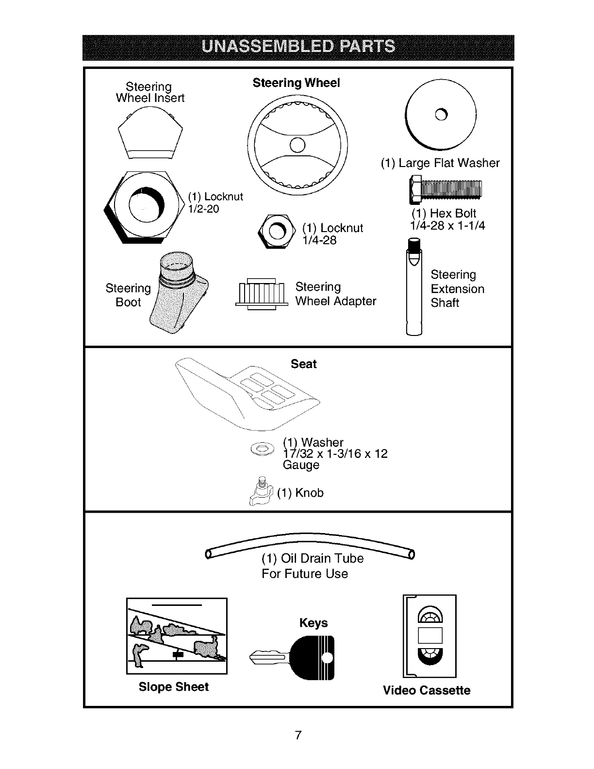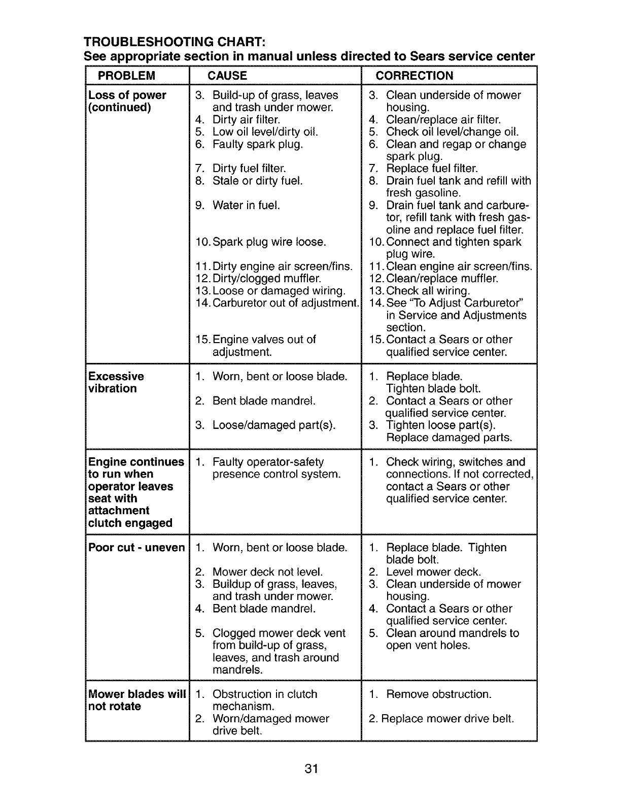 blades, spark plugs, air cleaners, belts, and oil filters.