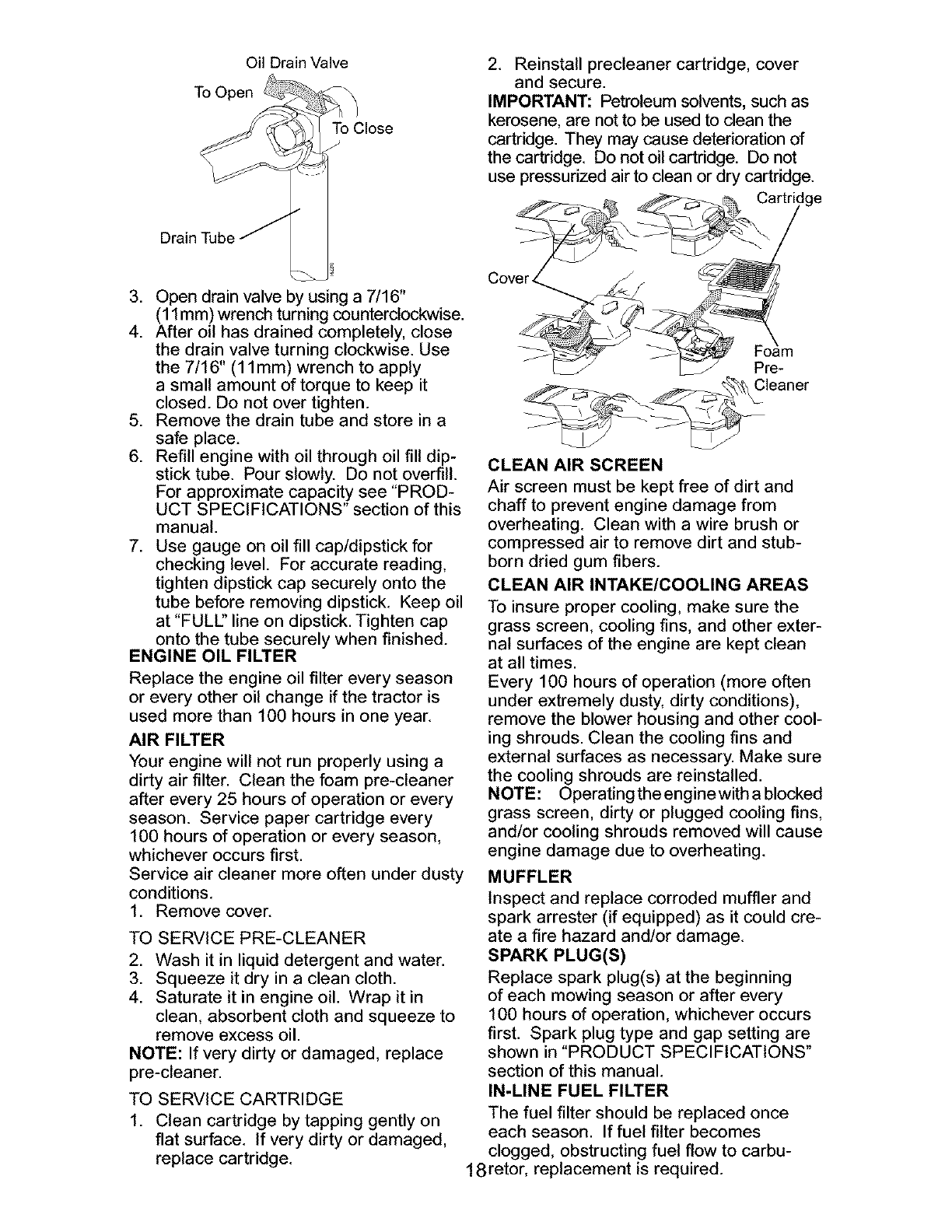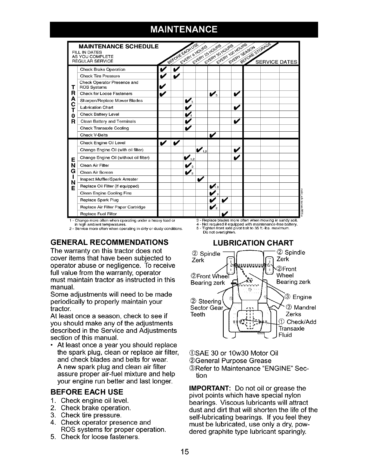 blades, spark plugs, air cleaners, belts, and oil filters.