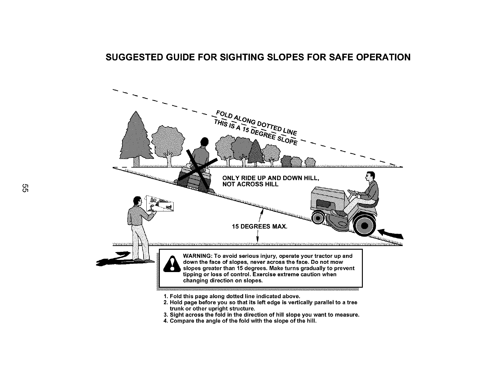 slopes greater than 15 degrees, Make turns gradually to prevent