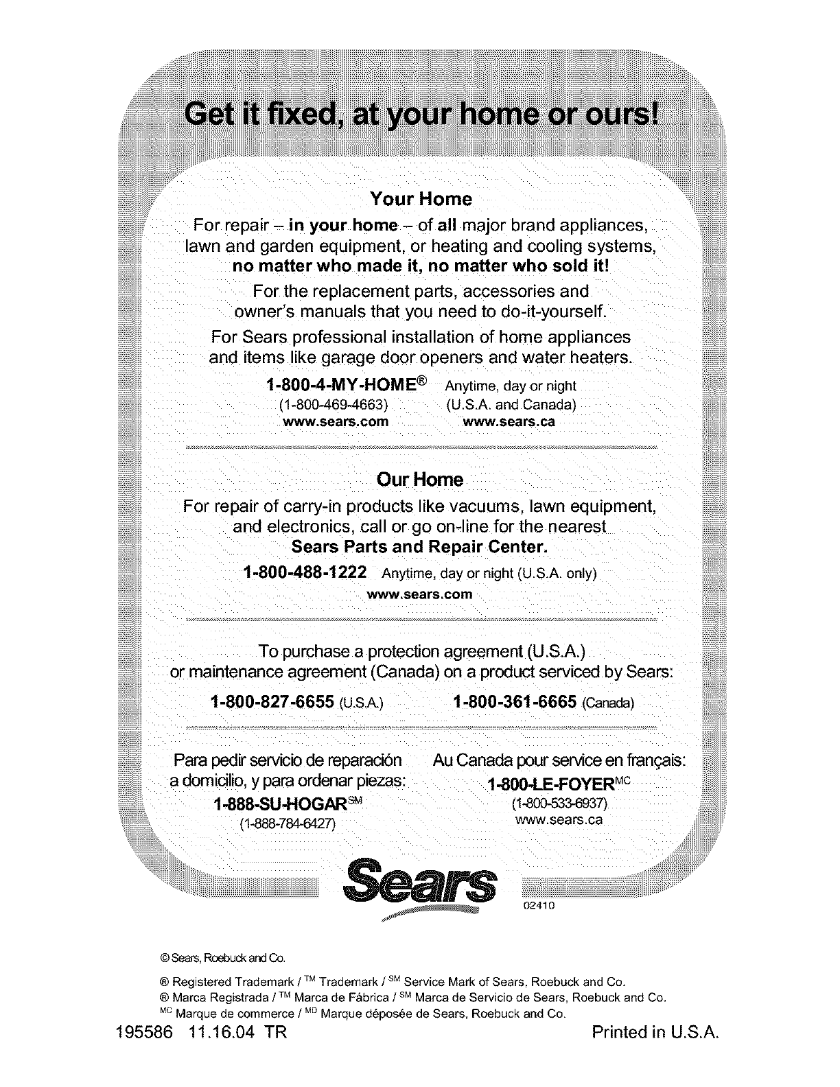 ® Marca Registrada /TM Marca de F&bdca /sM Marca de Servicio de Sears, Roebuck and Co.