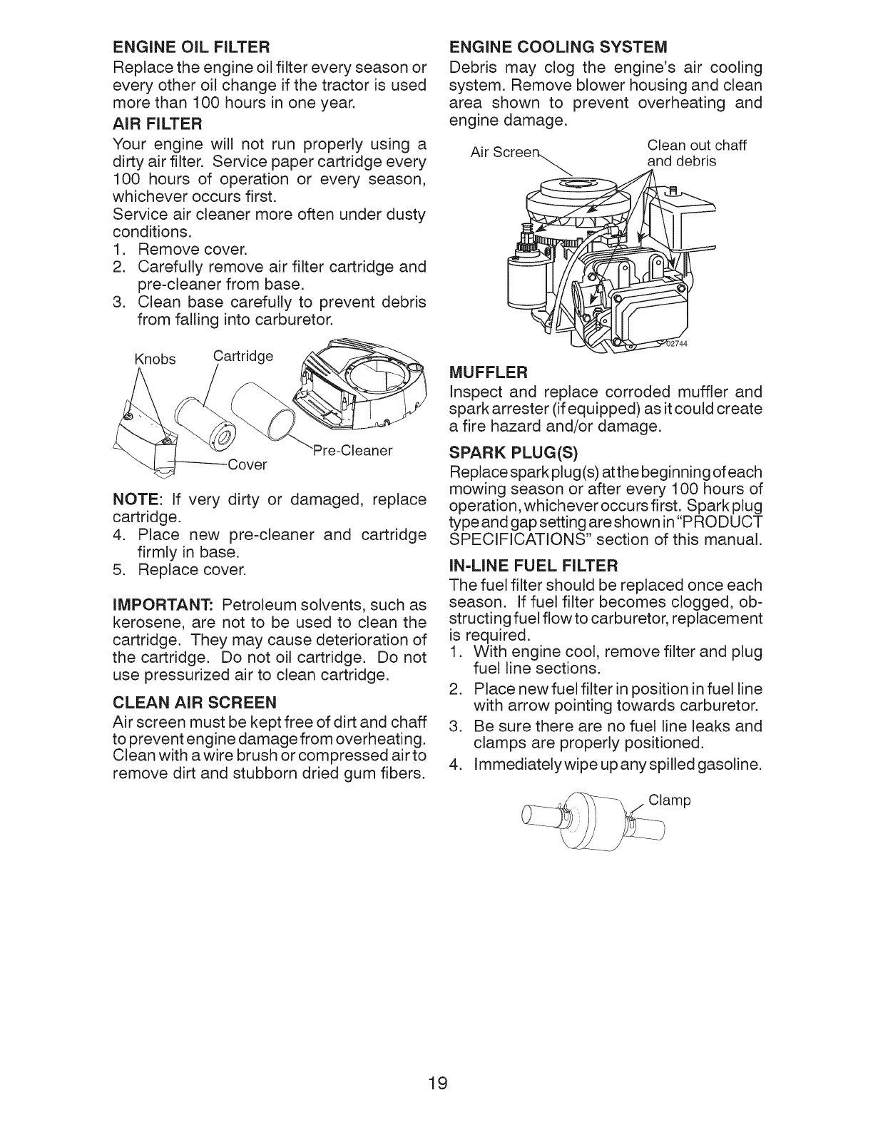 blades, spark plugs, air cleaners, belts, and oil filters.