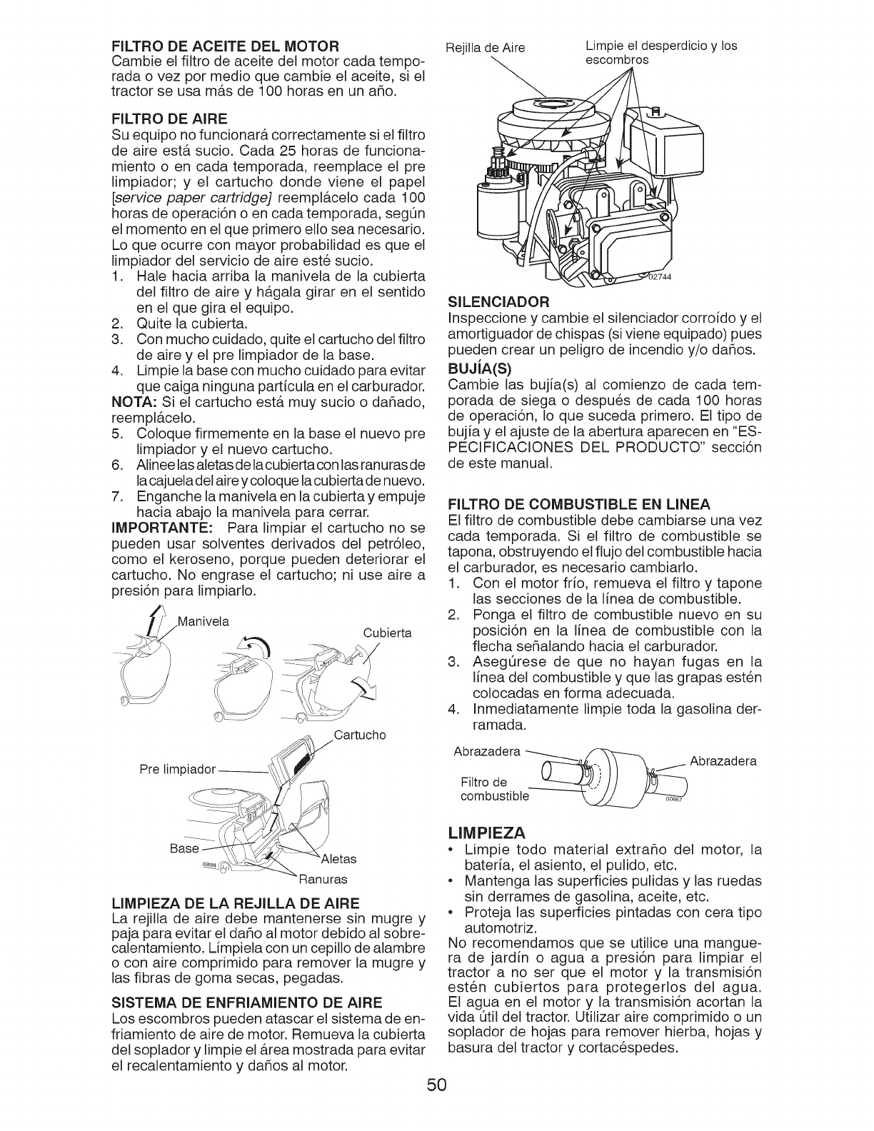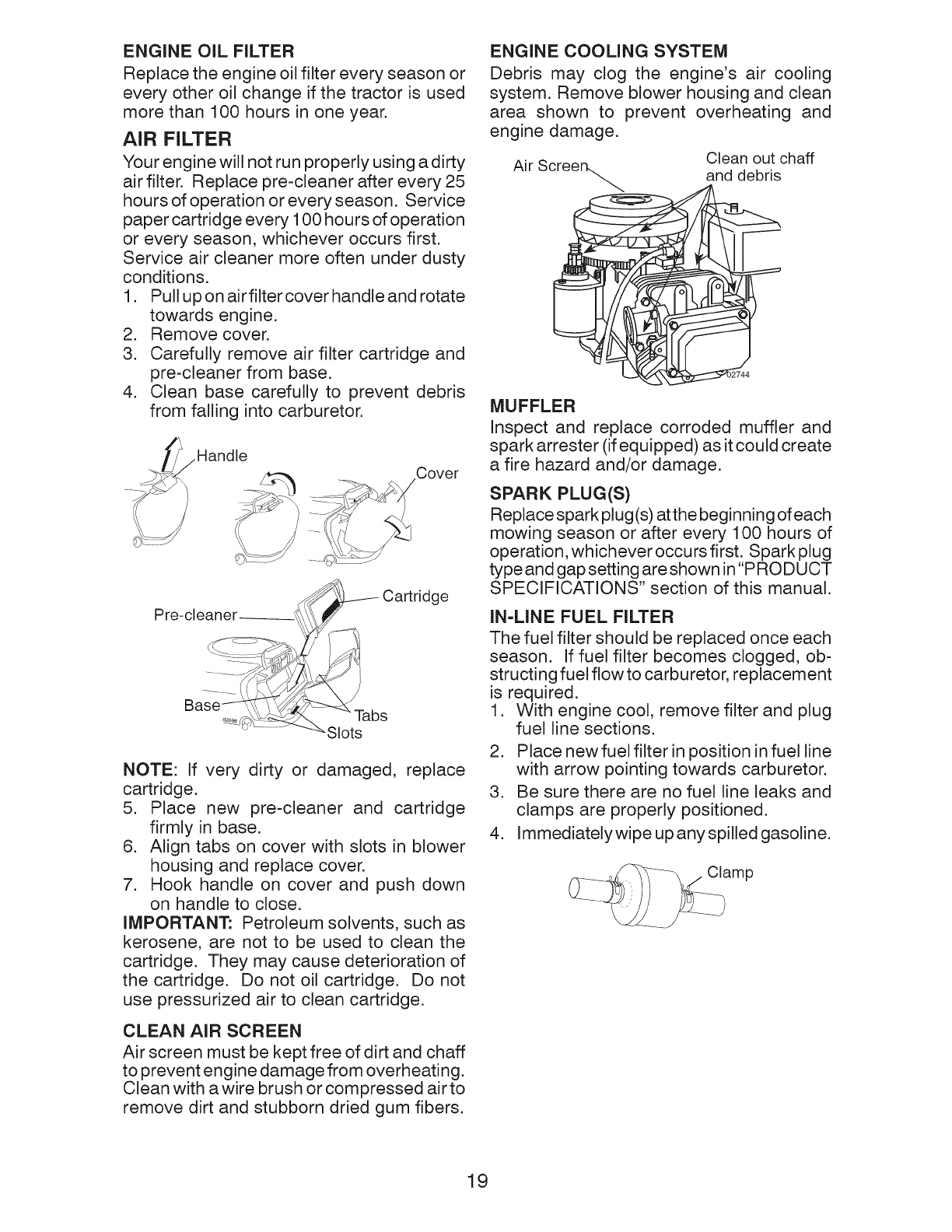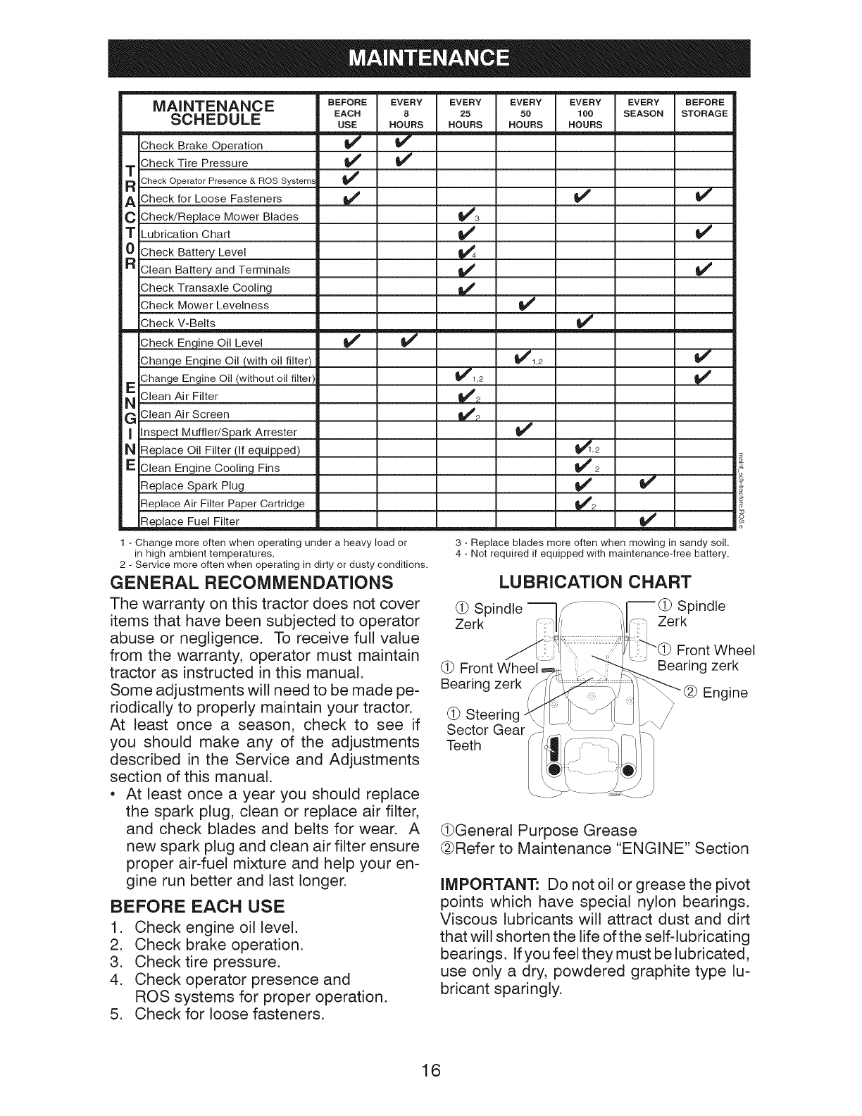 blades, spark plugs, air cleaners, belts, and oil filters.