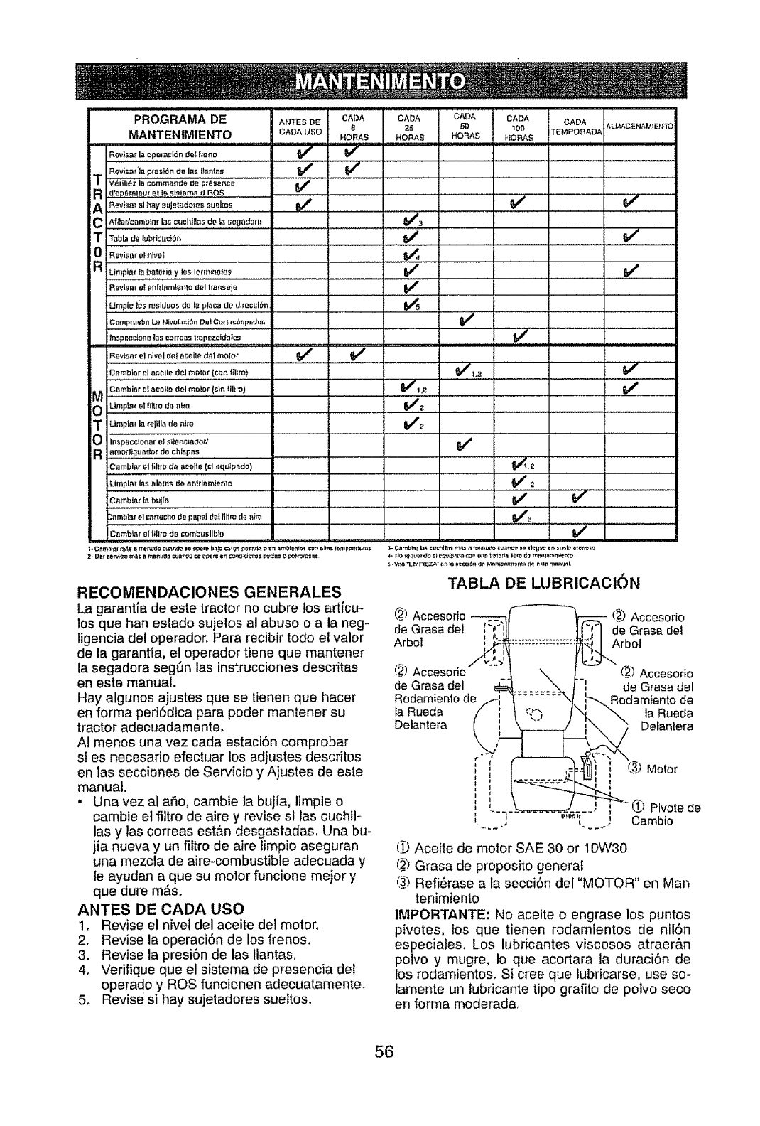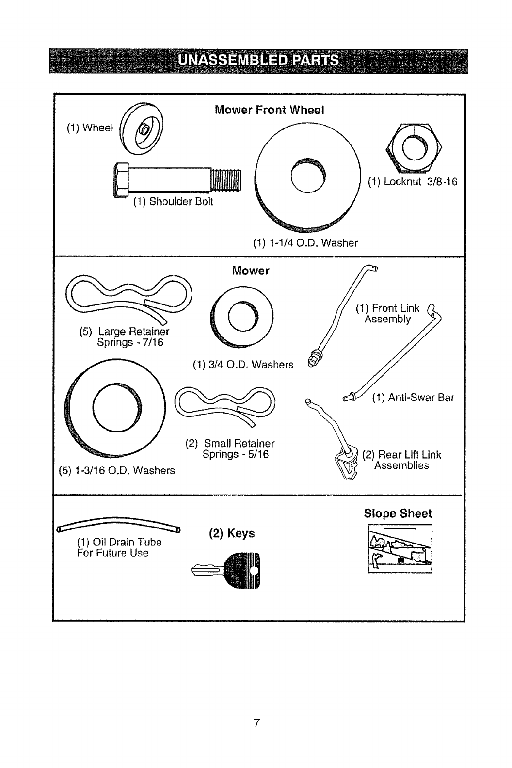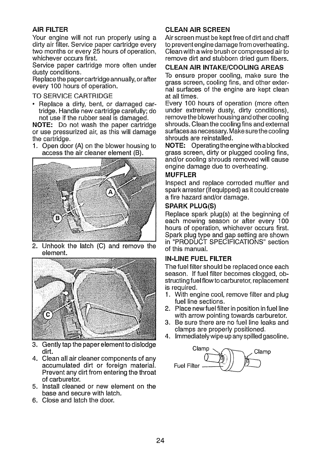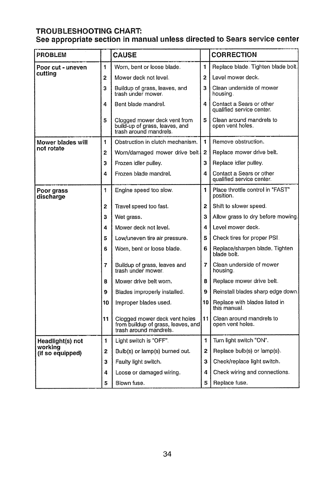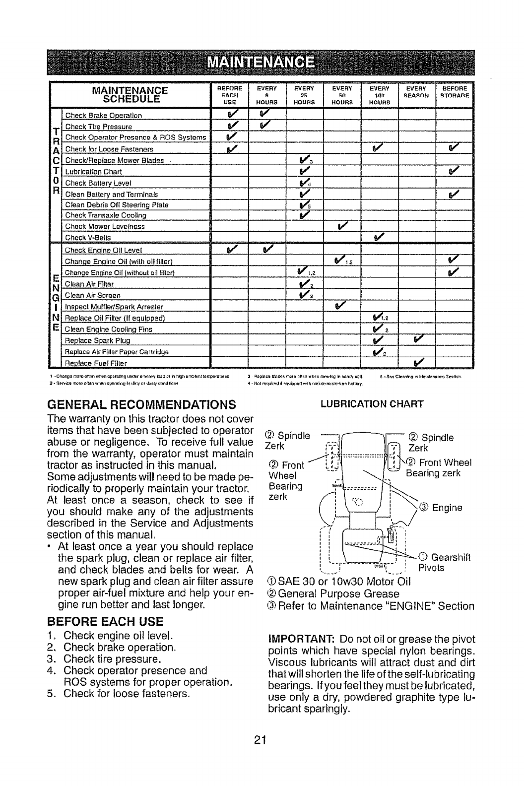 blades, spark plugs, air cleaners, belts, and oil filters.