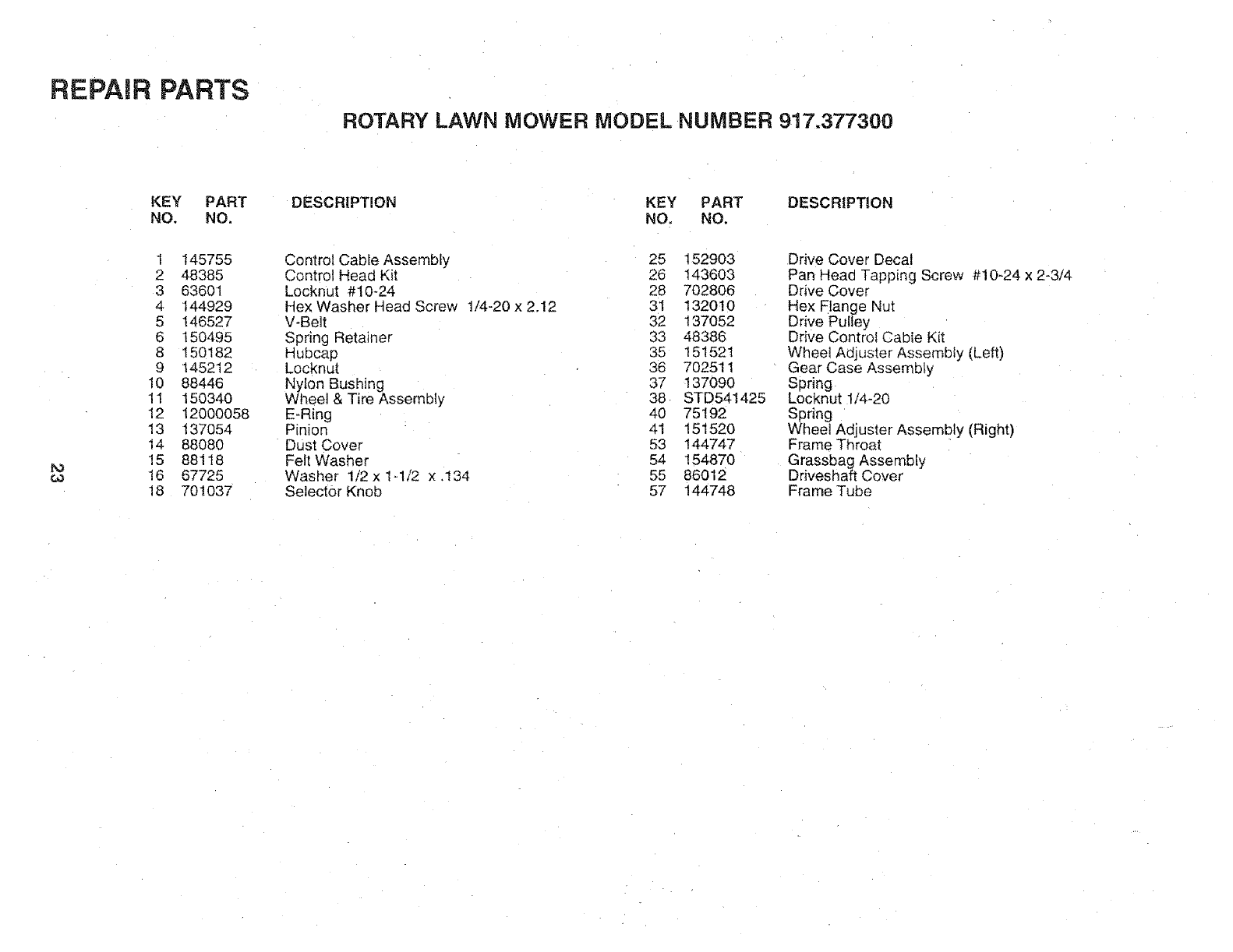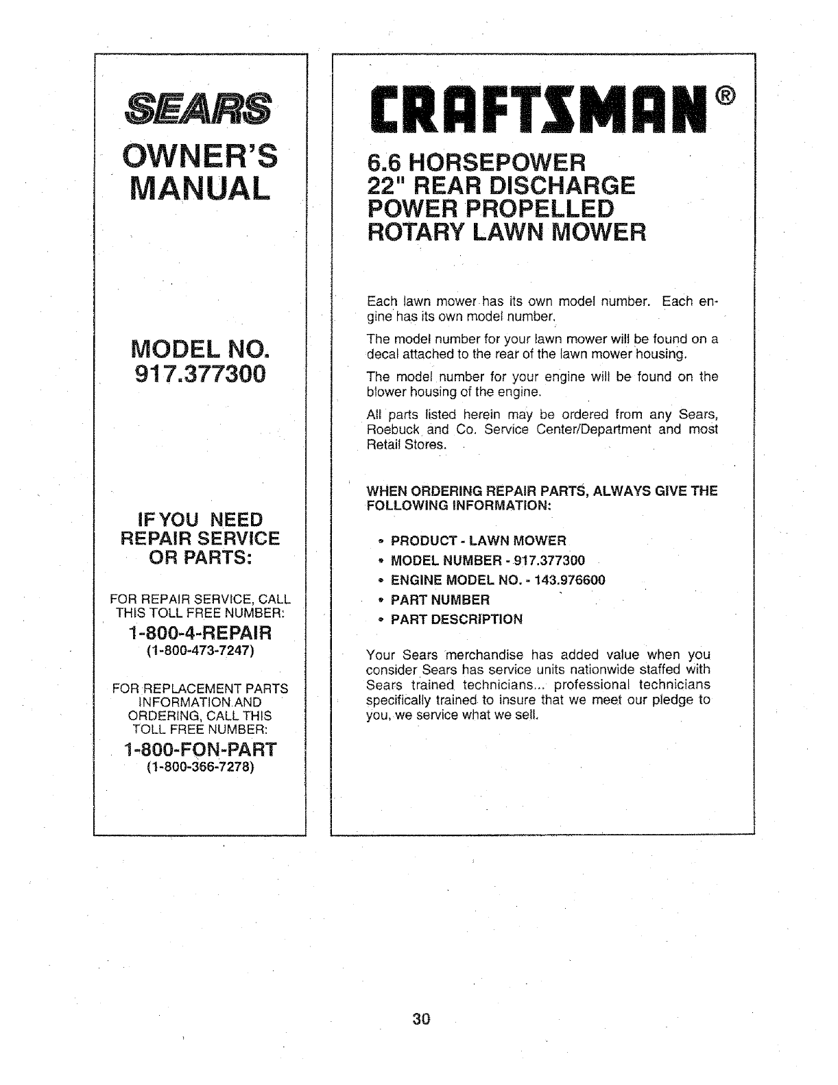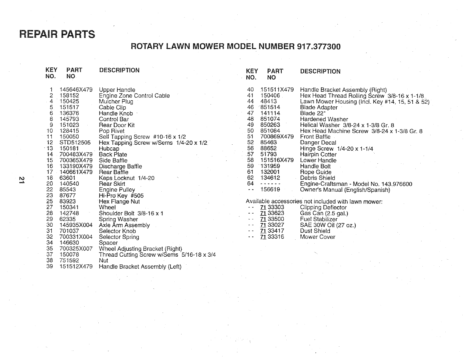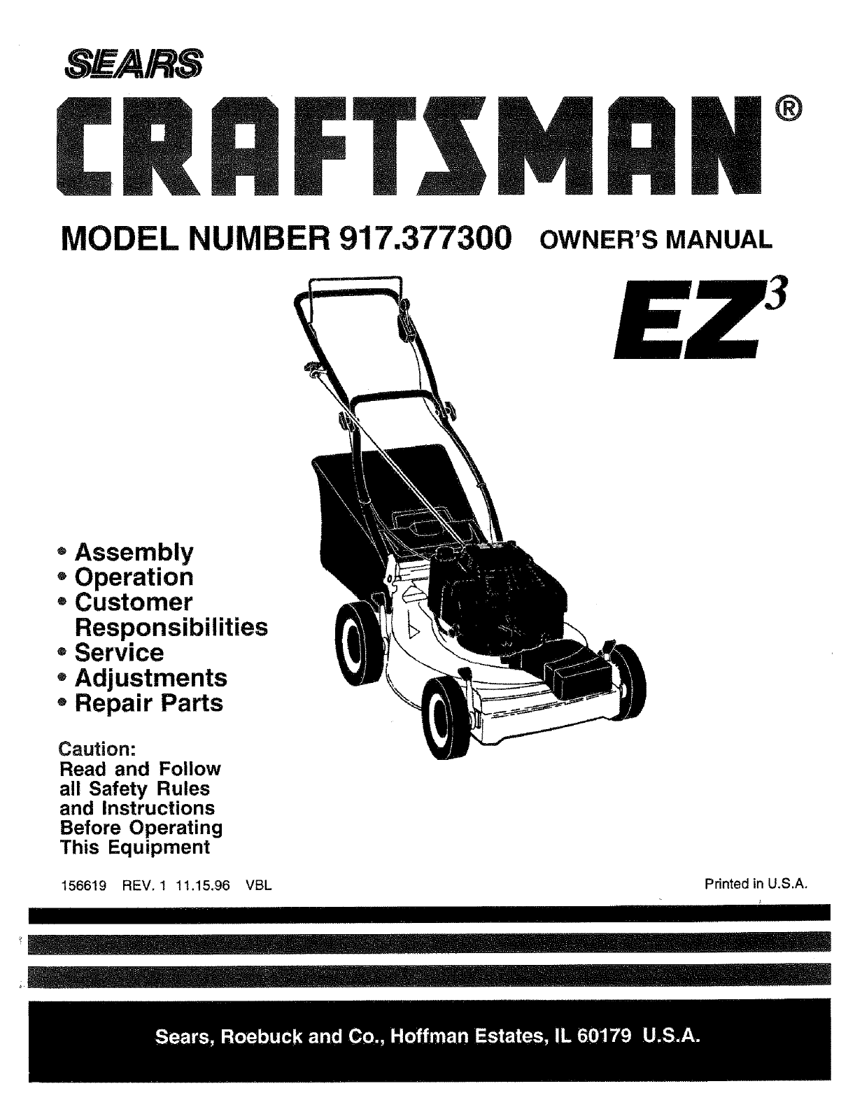 917377300 917377300 CRAFTSMAN ROTARY LAWN MOWER (1996 ) - Manuals and Guides L0806246 View the owners manual for your CRAFTSMAN ROTARY LAWN MOWER (1996 ) #917377300. Home:Lawn & Garden Parts:Craftsman Parts:Craftsman ROTARY LAWN MOWER (1996 ) Manual