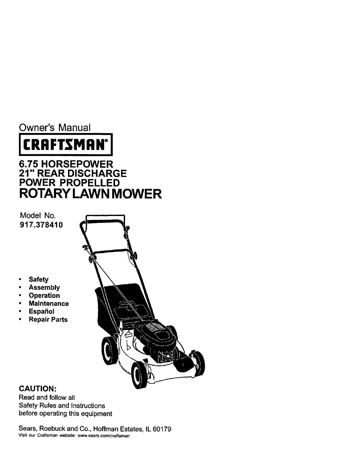 917378410 917378410 CRAFTSMAN Gas, Walk Behind Lawnmower - Manuals and Guides L0102263 View the owners manual for your CRAFTSMAN Gas, Walk Behind Lawnmower #917378410. Home:Lawn & Garden Parts:Craftsman Parts:Craftsman Gas, Walk Behind Lawnmower Manual