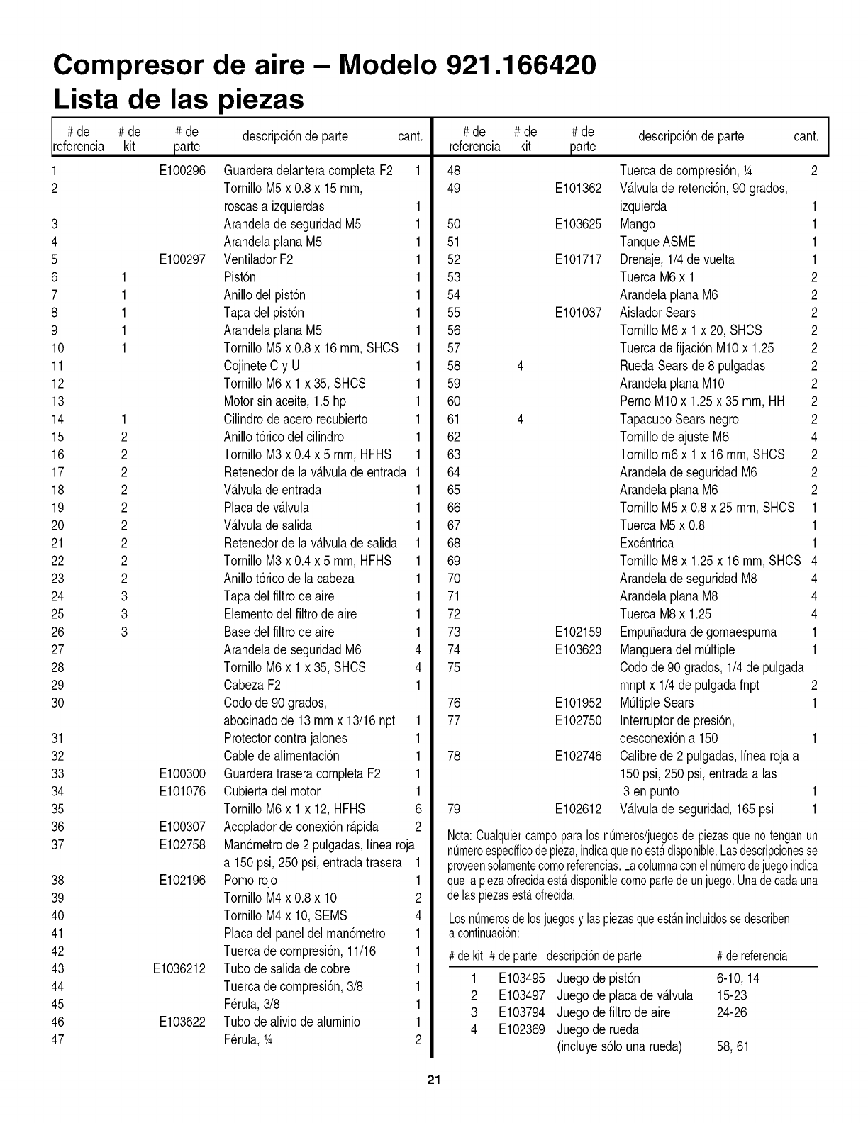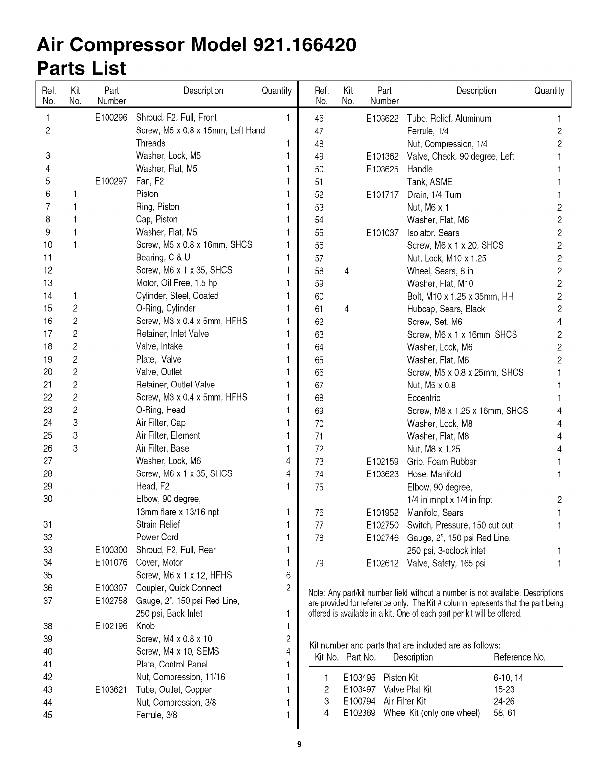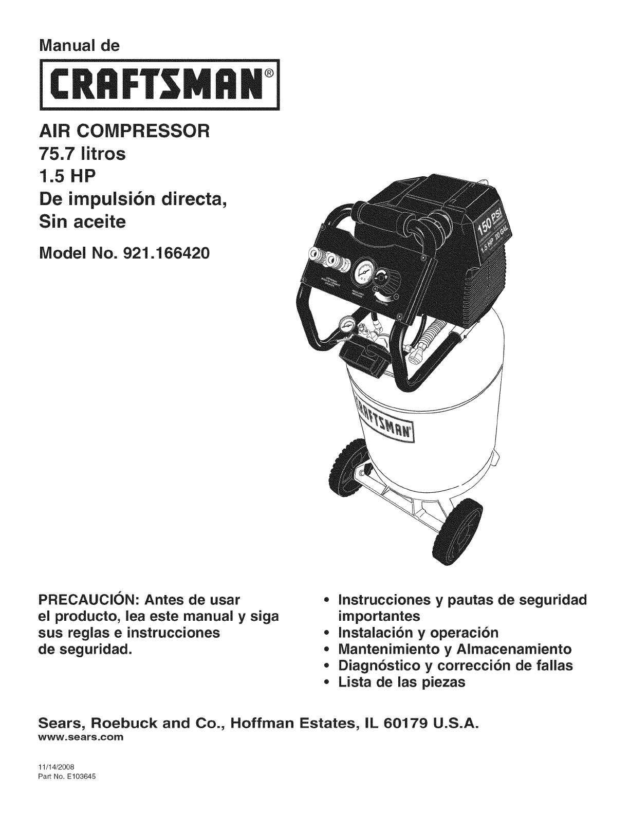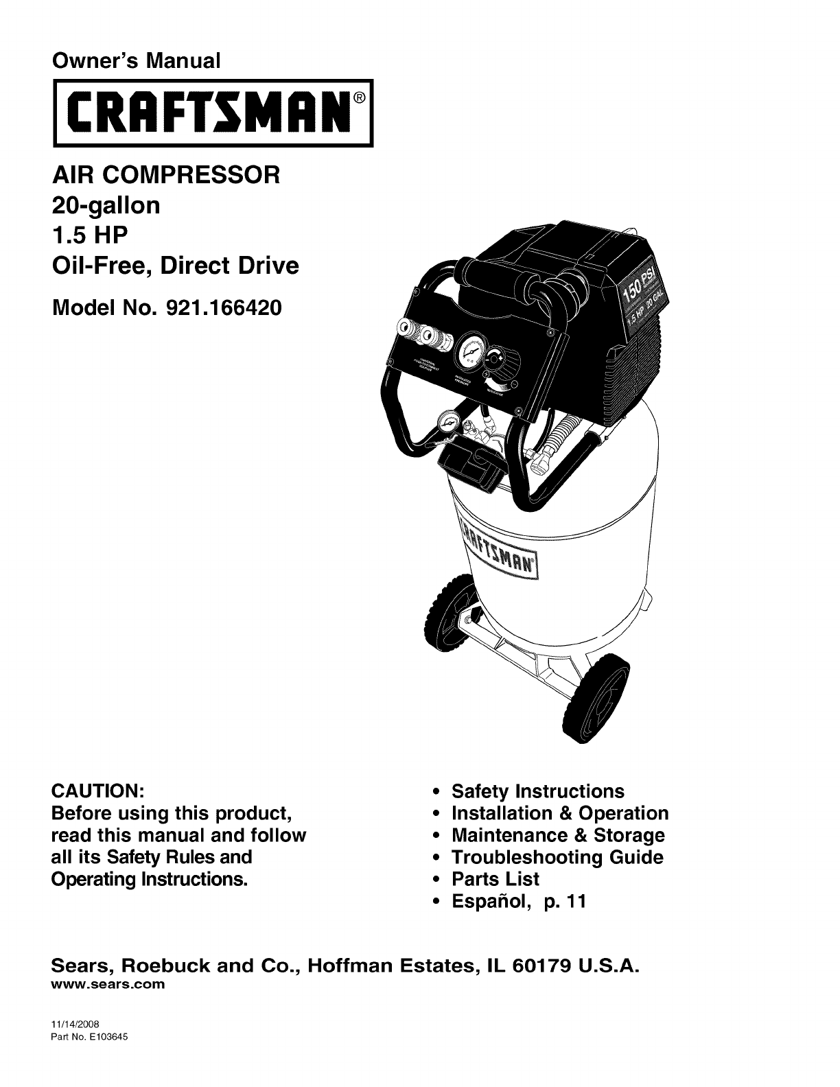 921166420 921166420 CRAFTSMAN AIR COMPRESSOR - Manuals and Guides L0906138 View the owners manual for your CRAFTSMAN AIR COMPRESSOR #921166420. Home:Tool Parts:Craftsman Parts:Craftsman AIR COMPRESSOR Manual