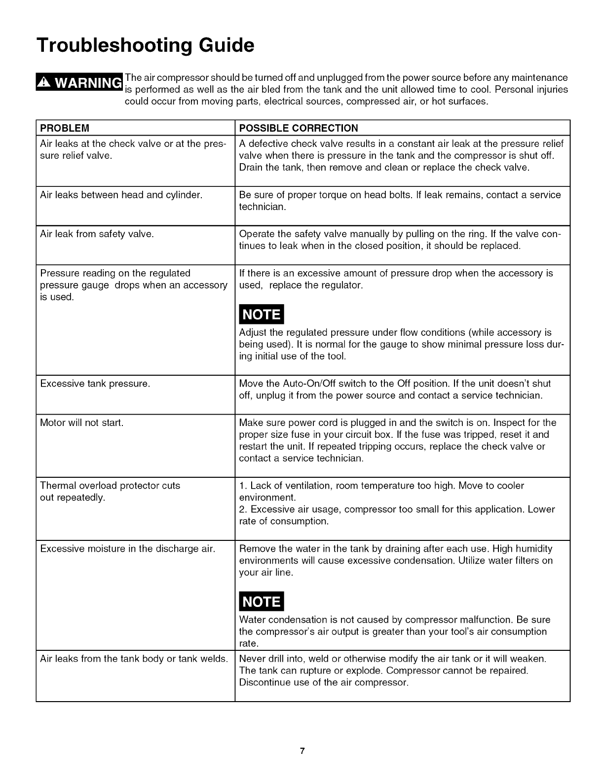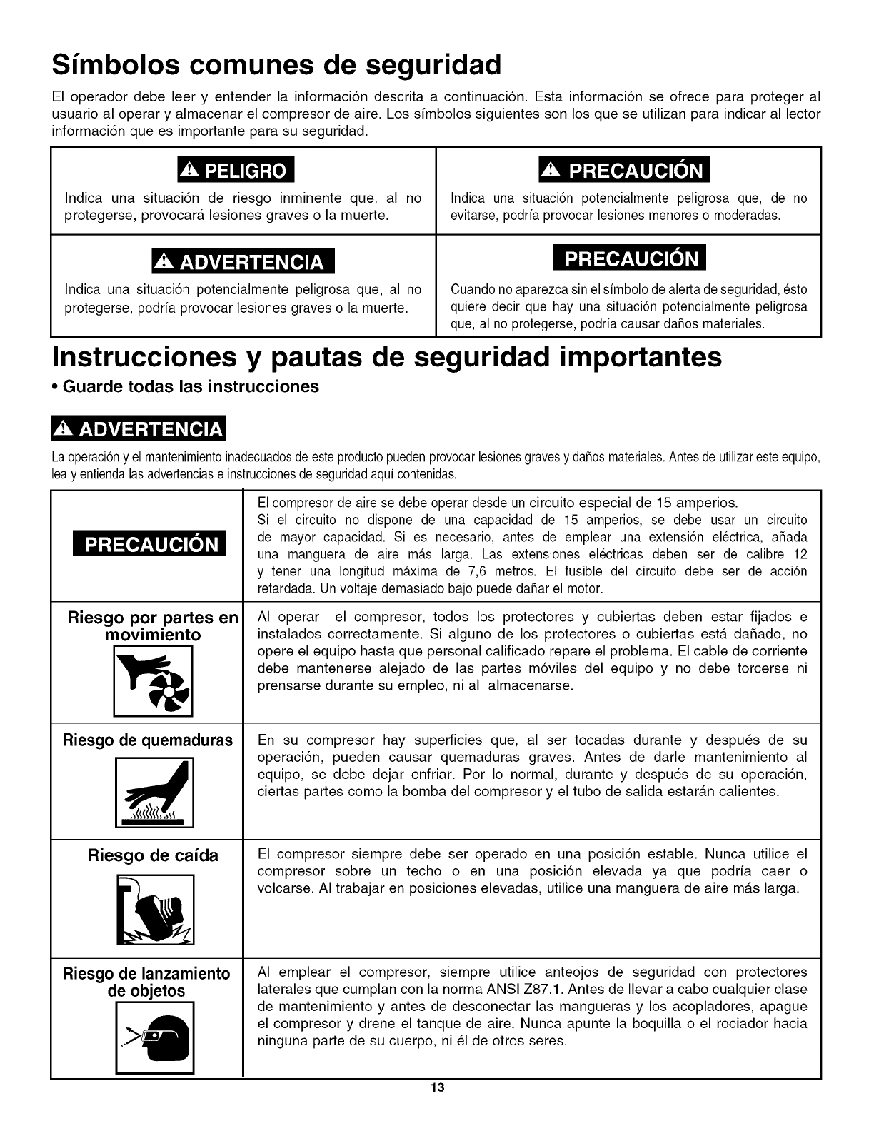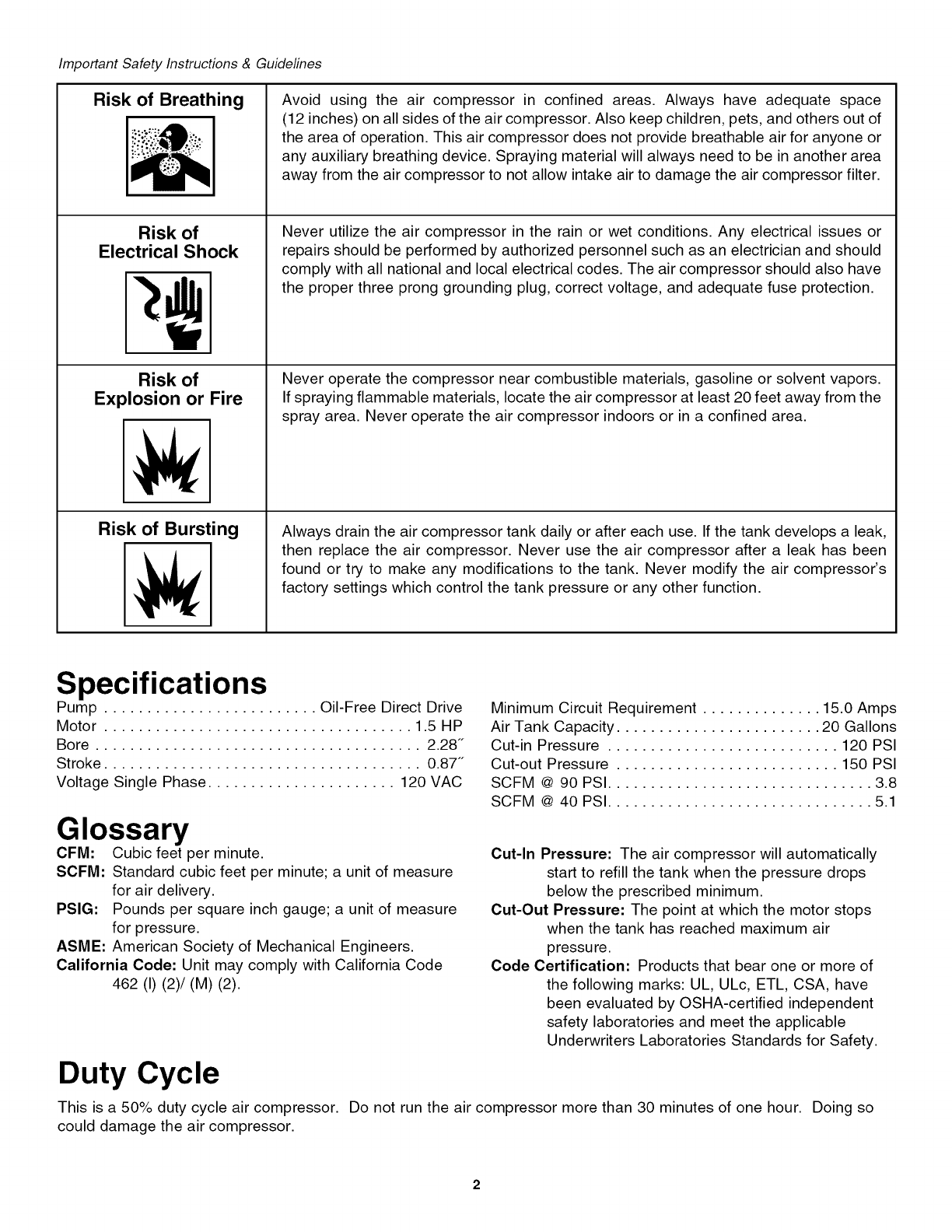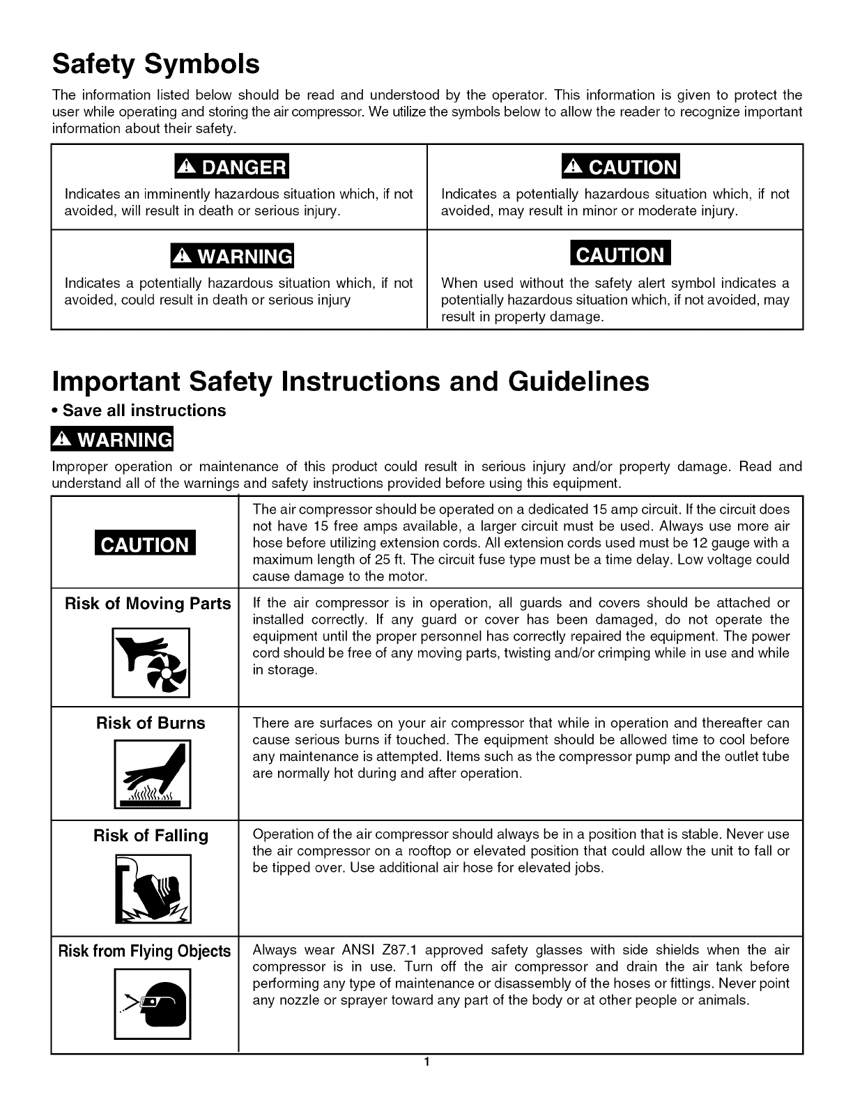 user while operating and storing the air compressor. We utilize the symbols below to allow the reader to recognize important