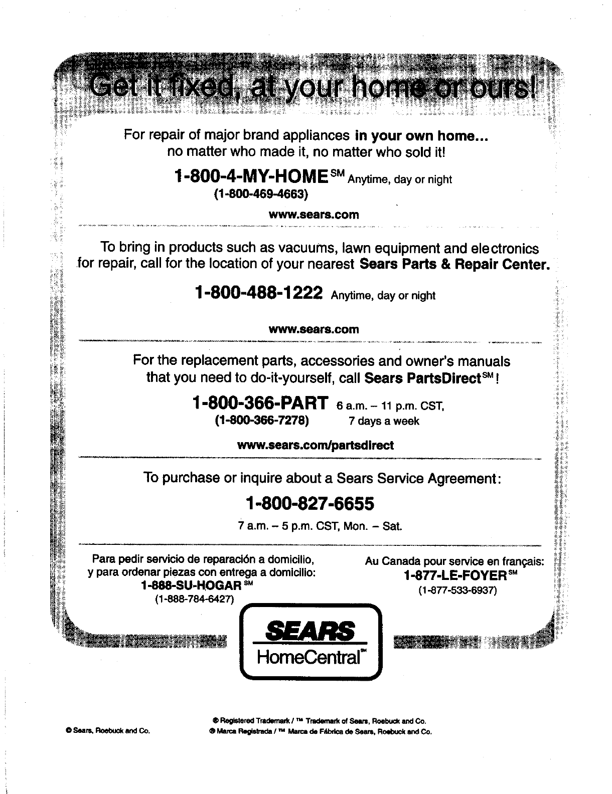 for repair, call for the location of your nearest Sears Parts & Repair Center.