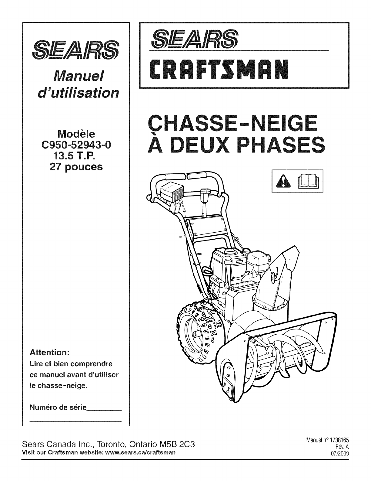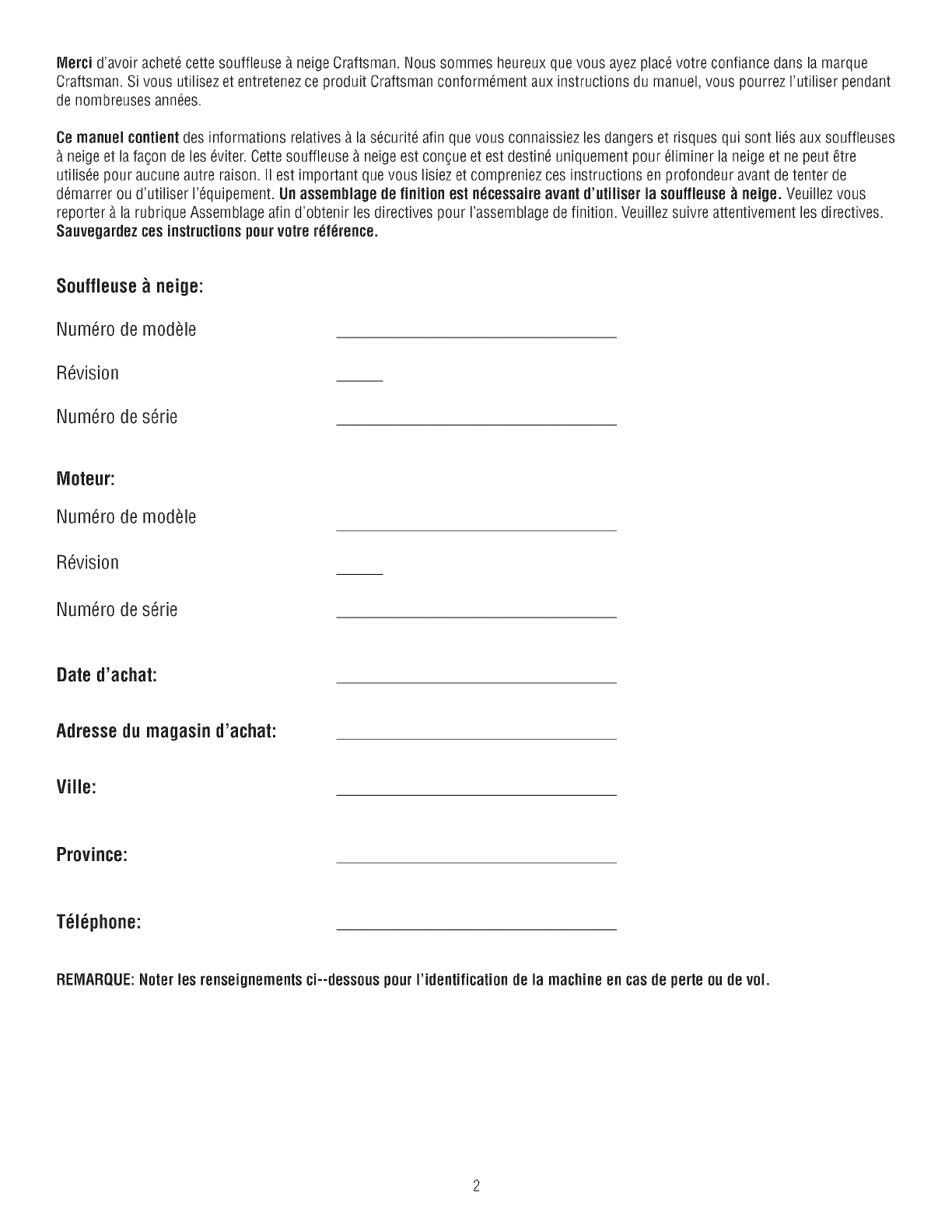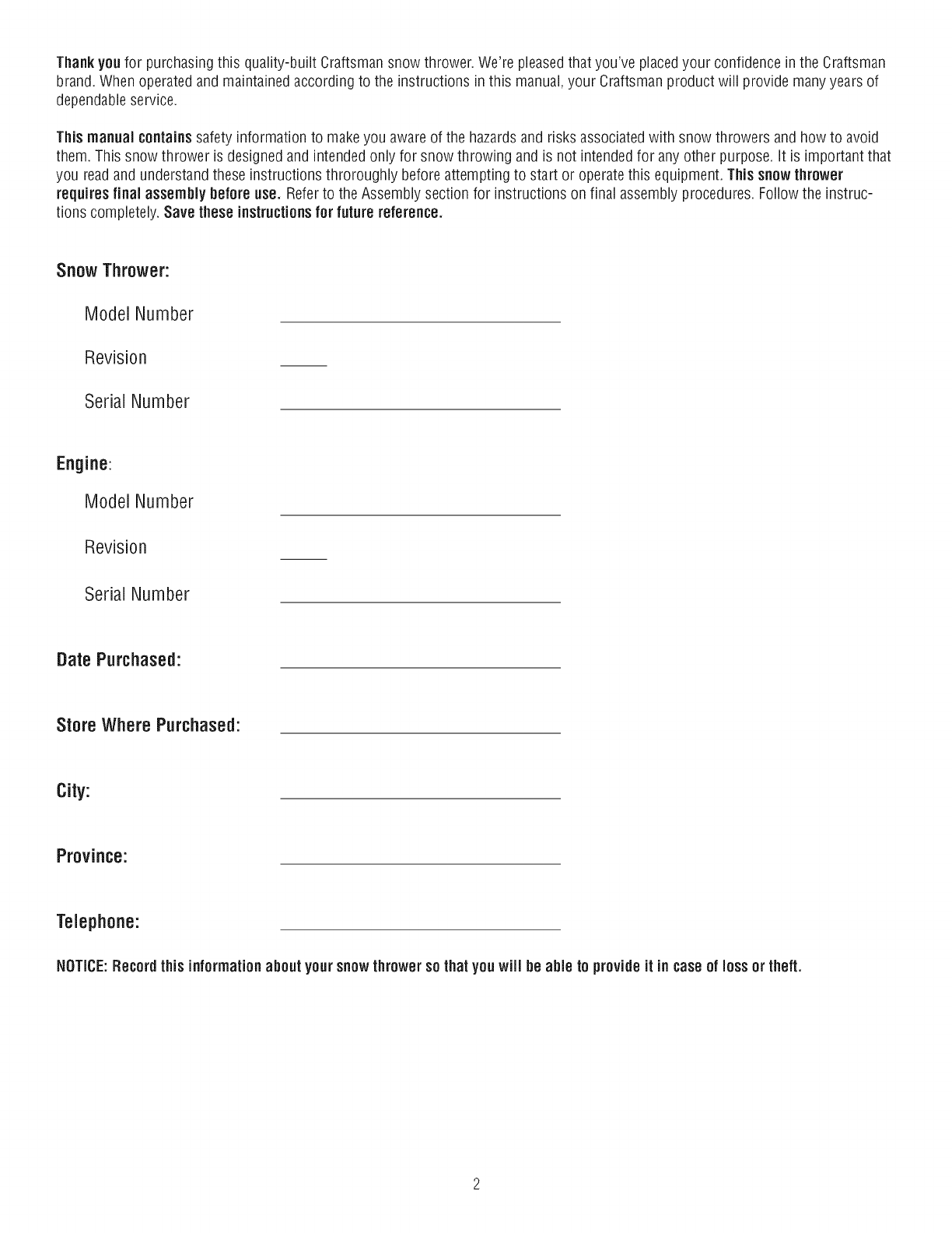 Thankyou for purchasingthis quality-built Craftsman snow thrower. We're pleasedthat you've placedyour confidence inthe Craftsman