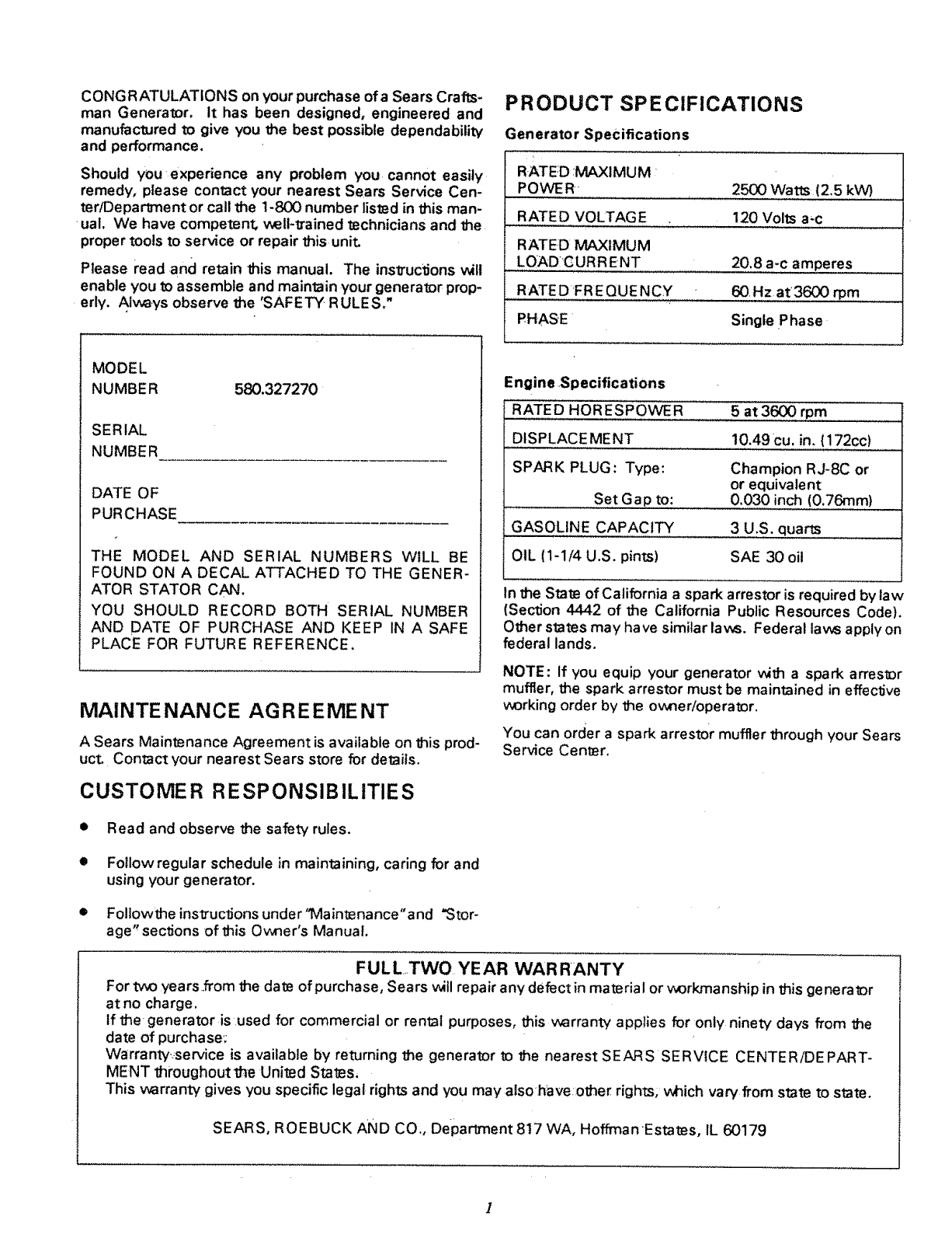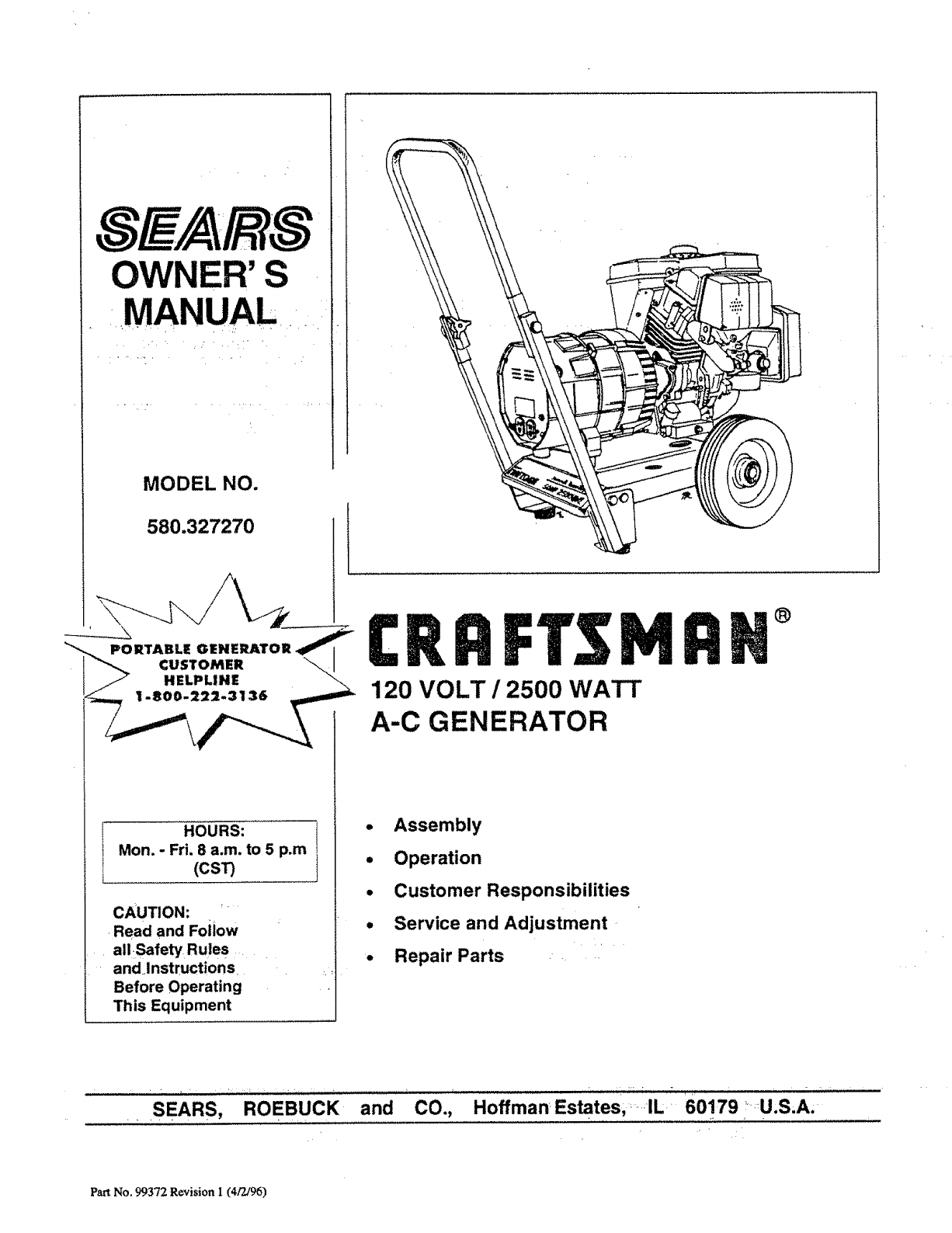 Craftsman Generator 580 32727 Users Manual