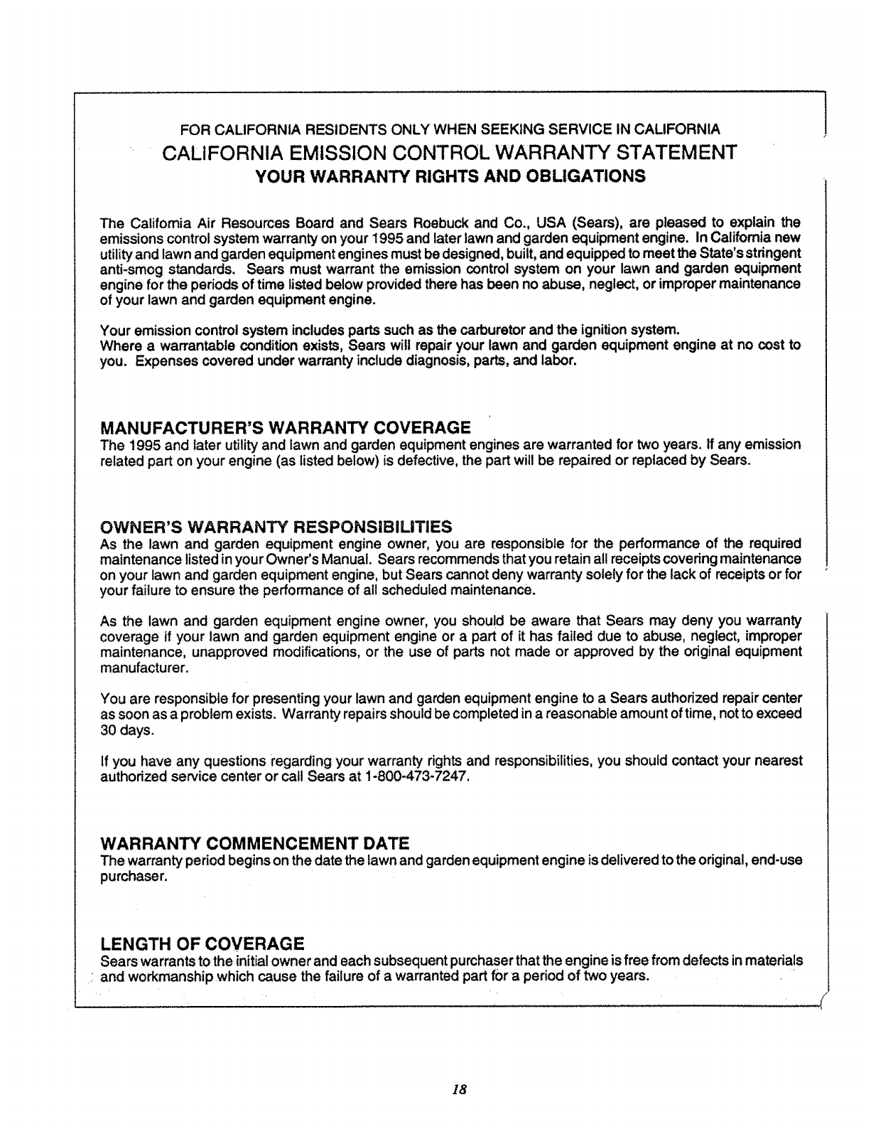 anti-smog standards. Sears must warrant the emission control system on your lawn and garden equipment