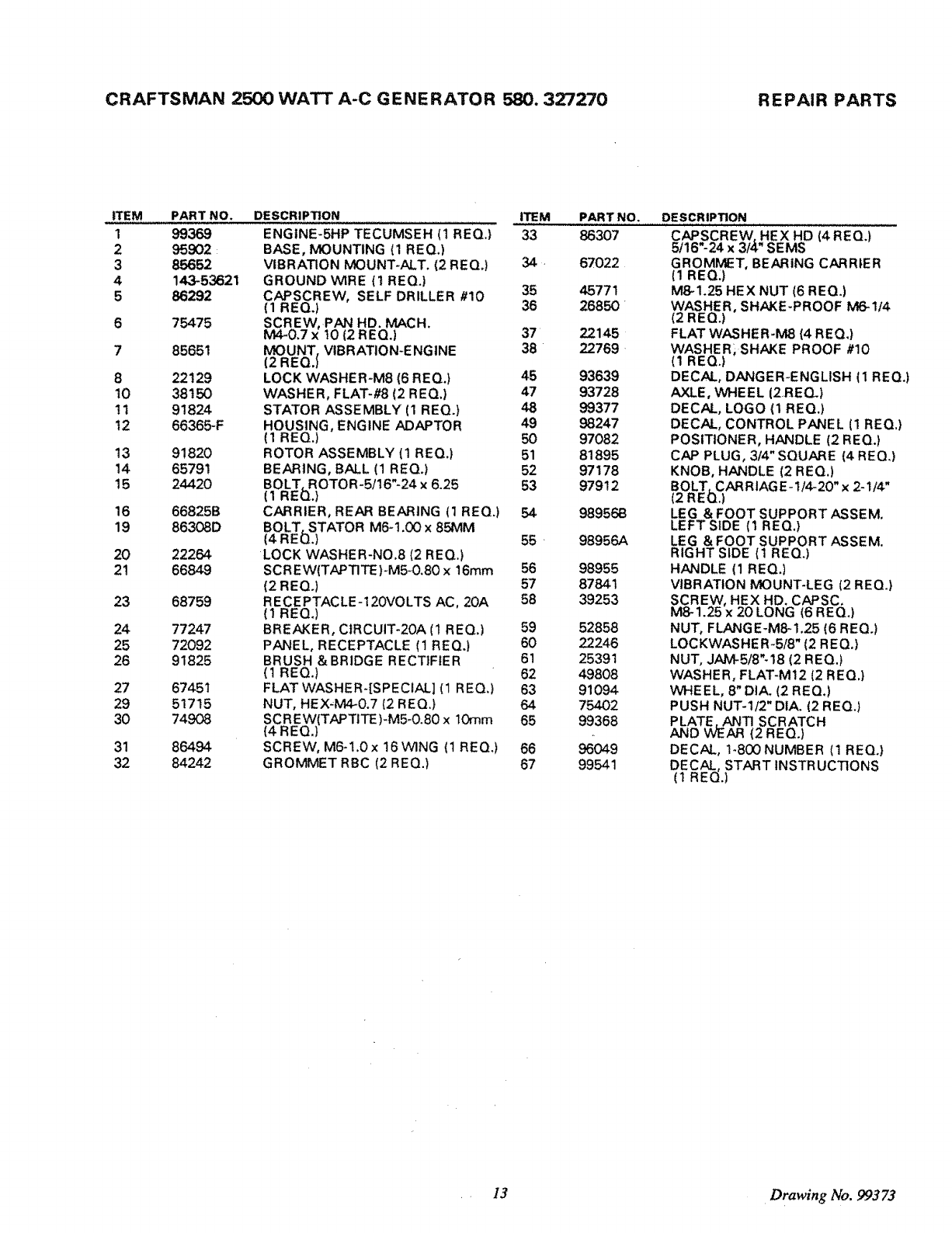 580327270 580327270 CRAFTSMAN GENERATOR - Manuals and Guides L0901001 View the owners manual for your CRAFTSMAN GENERATOR #580327270. Home:Tool Parts:Craftsman Parts:Craftsman GENERATOR Manual