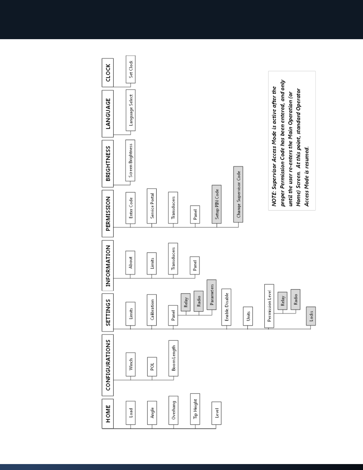 This illustration shows the basic layout of the system’s main menus and screens. The screens shaded in