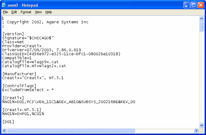oem.inf file “Copyright 2002, Agere System Inc”