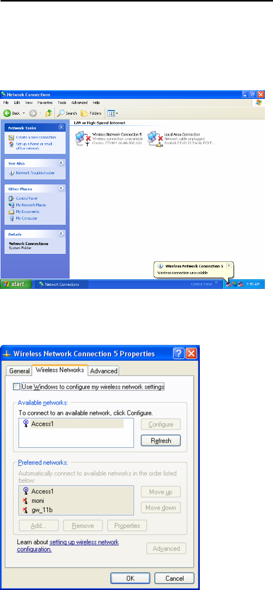 To configure the WLAN Card go to the “Network Connections”< start –control