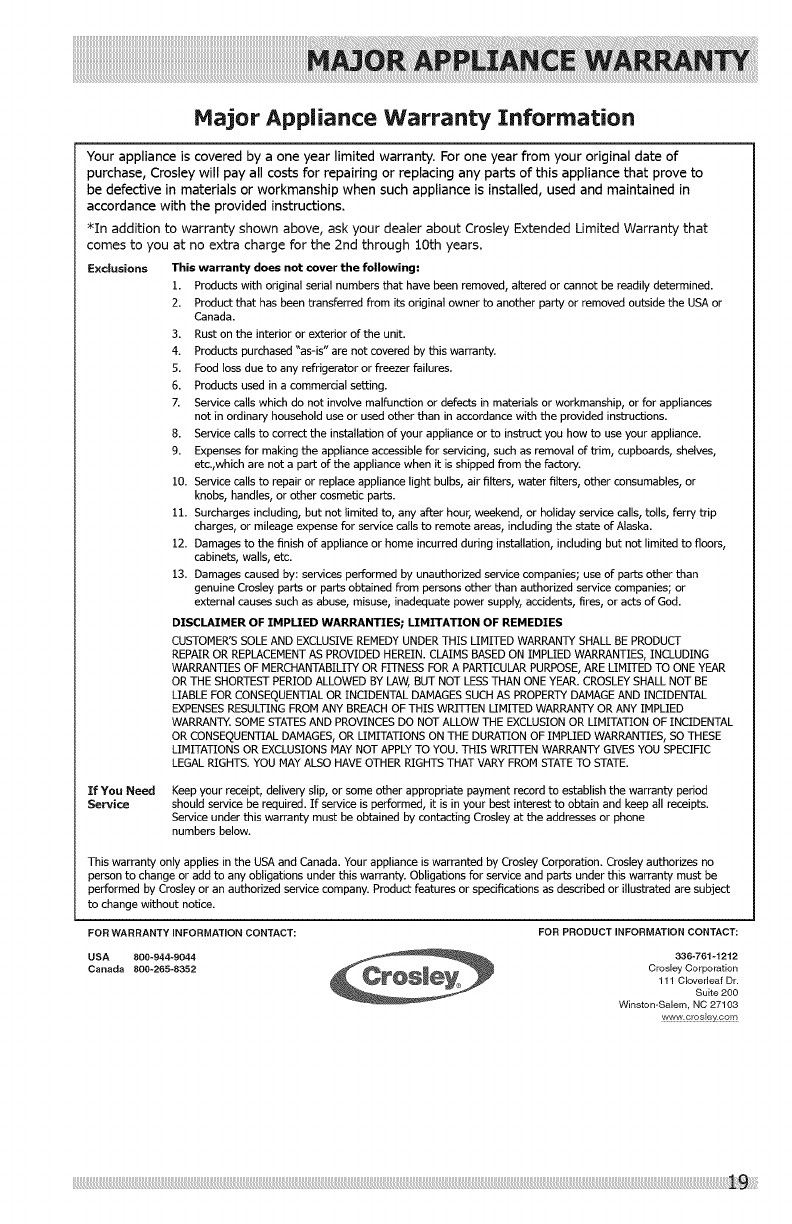 This warranty only applies in the USA and Canada. Your appliance is warranted by Crosley Corporation. Crosley authorizes no