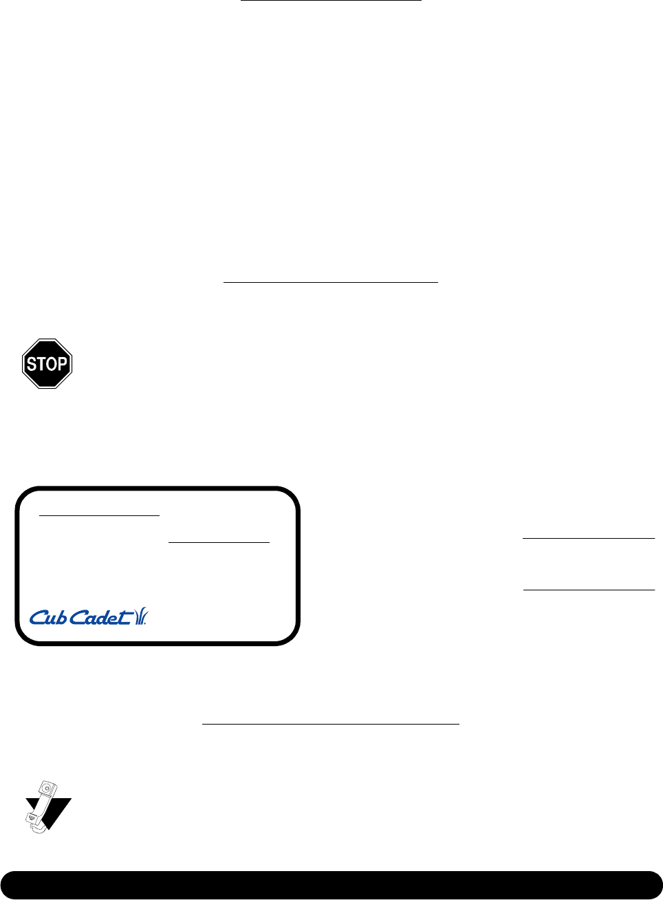Contact your authorized Cub Cadet servicing dealer who sold you your Cub Cadet equipment. If this dealer is