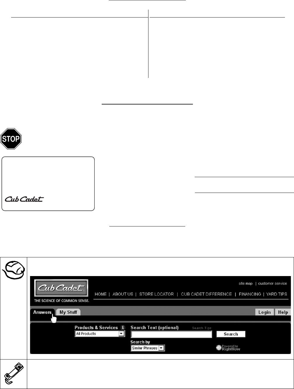 will be necessary to use the manufacturer’s web site and/or help from your Cub Cadet dealer.