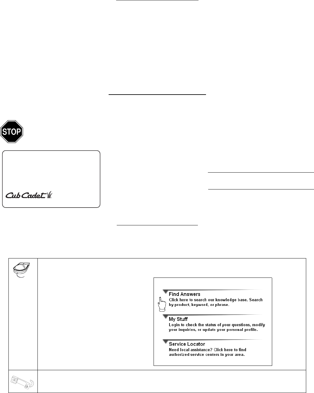 will be necessary to use the manufacturer’s web site and/or help from your Cub Cadet dealer.
