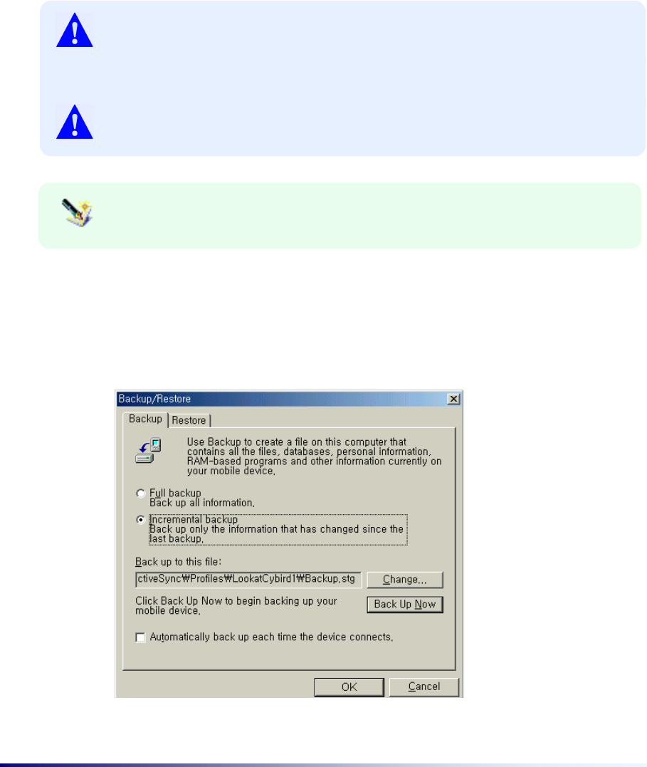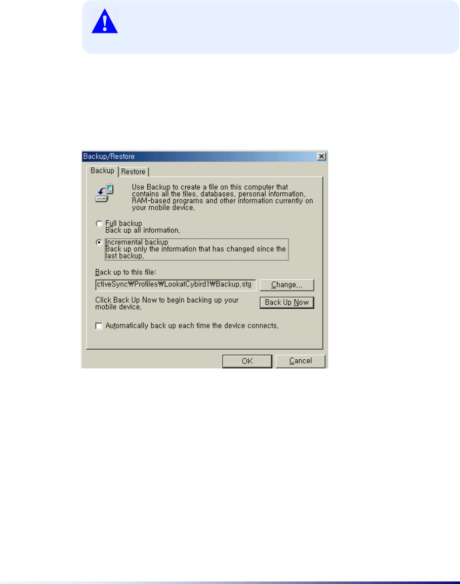 in RAM to your desktop PC using Microsoft ActiveSync, and restore them when needed.