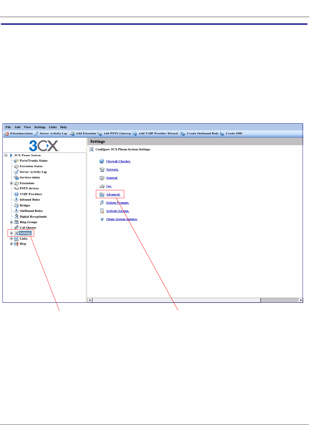 1. Log into the 3CX PBX system, select Settings, and then select Advanced. See Figure 5-1.