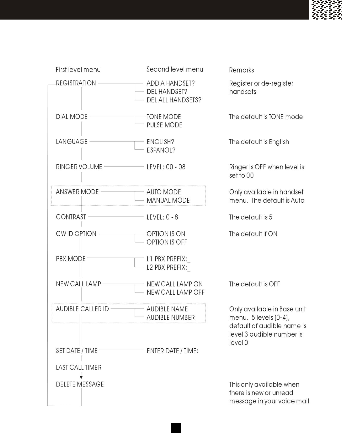 Audible Caller ID (Only available in base unit menu)....................................................27