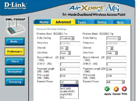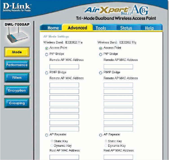 The DWL-7000AP offers transfer rates up to 54Mbps in either the 2.4GHz or 5GHz