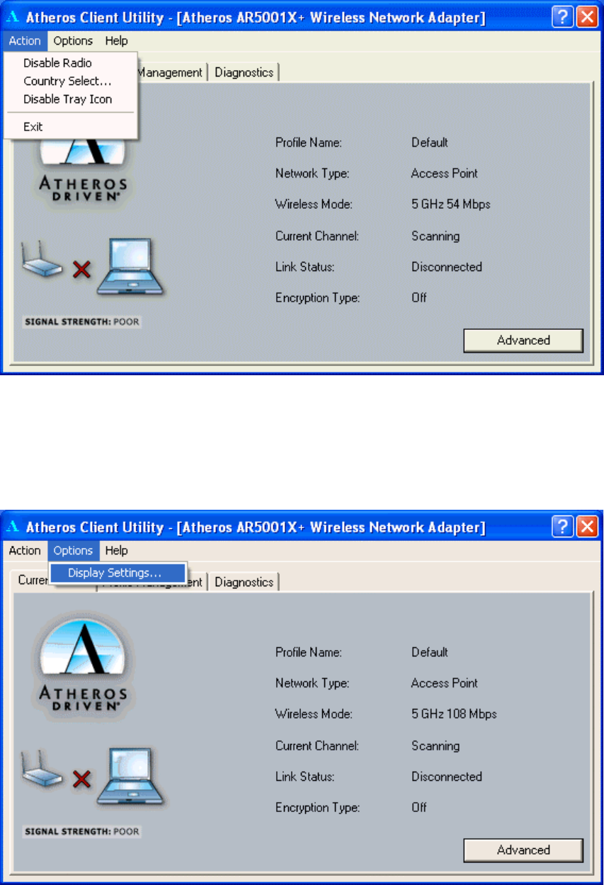 Click on “Action” on the menu selection to access functions such as “Disable Radio”,