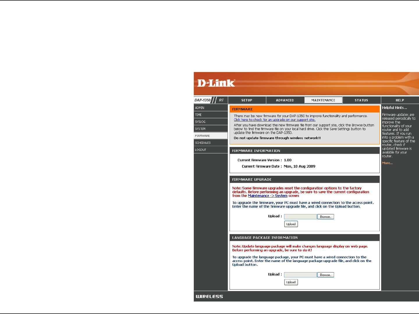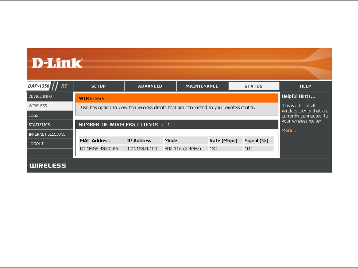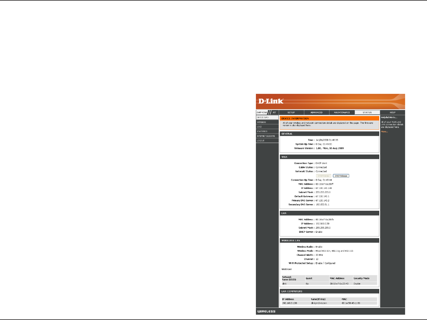 This page displays the current information for the DAP-1350. It will display the LAN, WAN (Internet), and Wireless information.