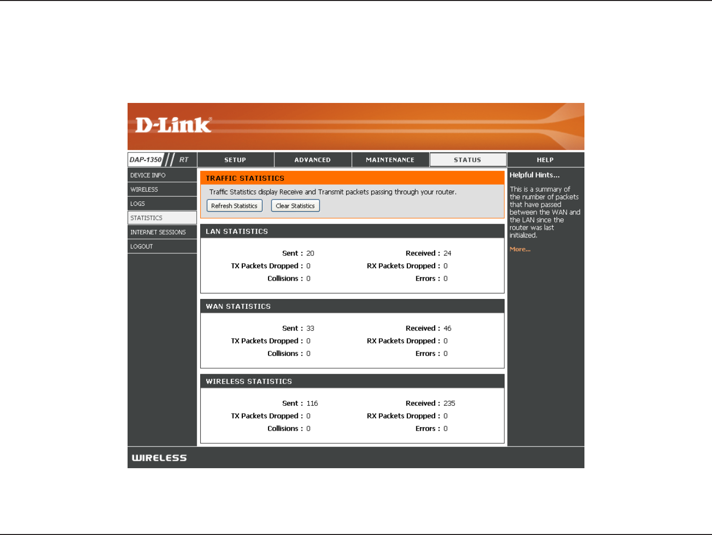 The screen below displays the Traffic Statistics. Here you can view the amount of packets that pass through the DAP-1350