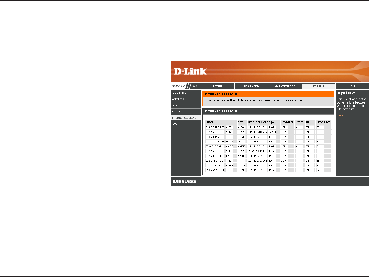 The Internet Sessions page displays full details of active Internet sessions through your router. An Internet session is a
