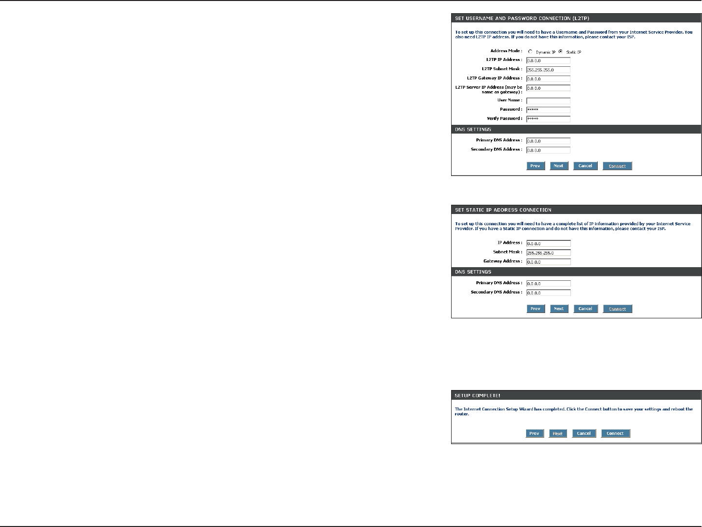 subnet mask, gateway address, and DNS address(es) provided to you by your ISP. Each IP address entered in the fields must be in the