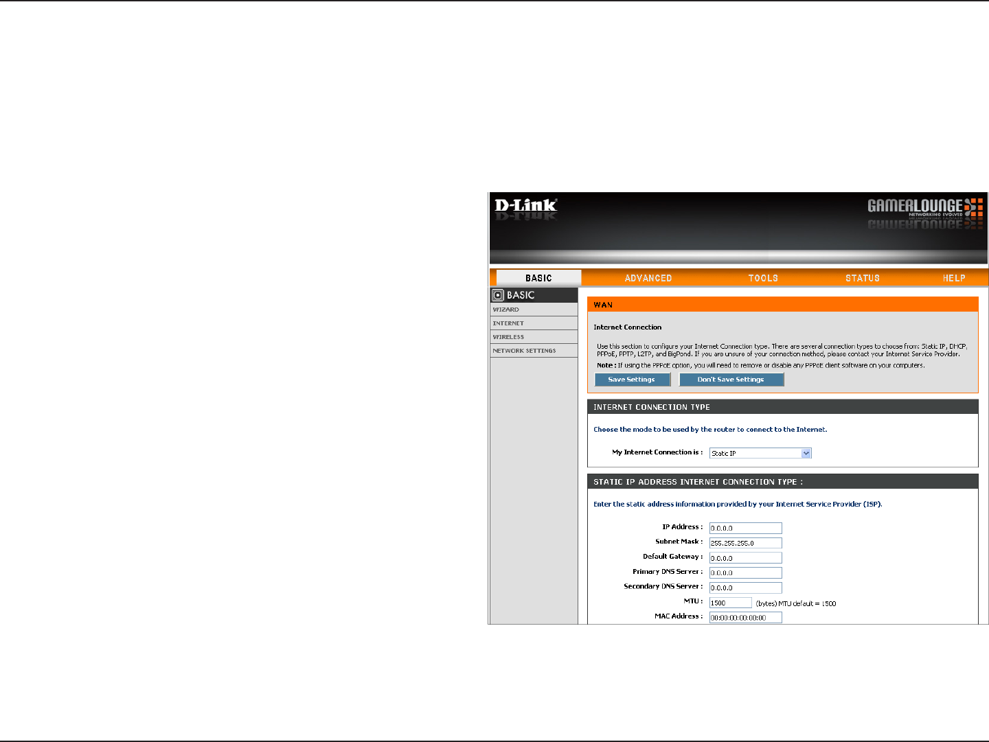 Select Static IP Address if all the Internet port’s IP information is provided to you by your ISP. You will need to enter in the IP address,