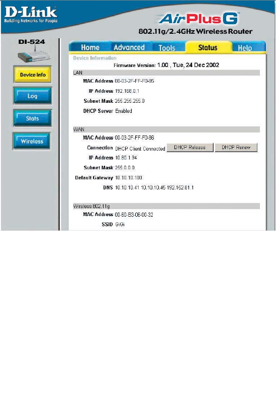 This page displays the current information for the DI-524. It will display the LAN, WAN,