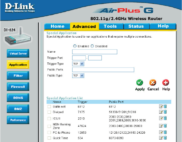 The DI-524 provides some predefined applications in the table on the bottom of the