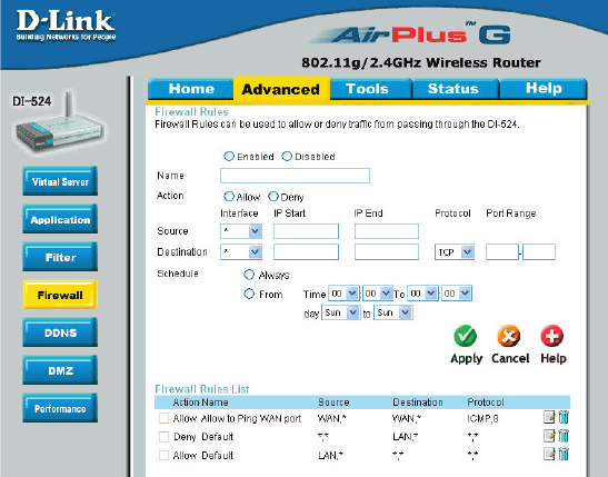 The DI-524 MAC Address filtering rules have precedence over the Firewall Rules.