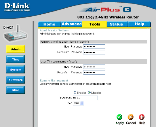 At this page, the DI-524 administrator can change the system password. There are two