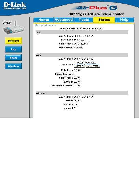This page displays the current information for the DI-524. It will display the LAN, WAN