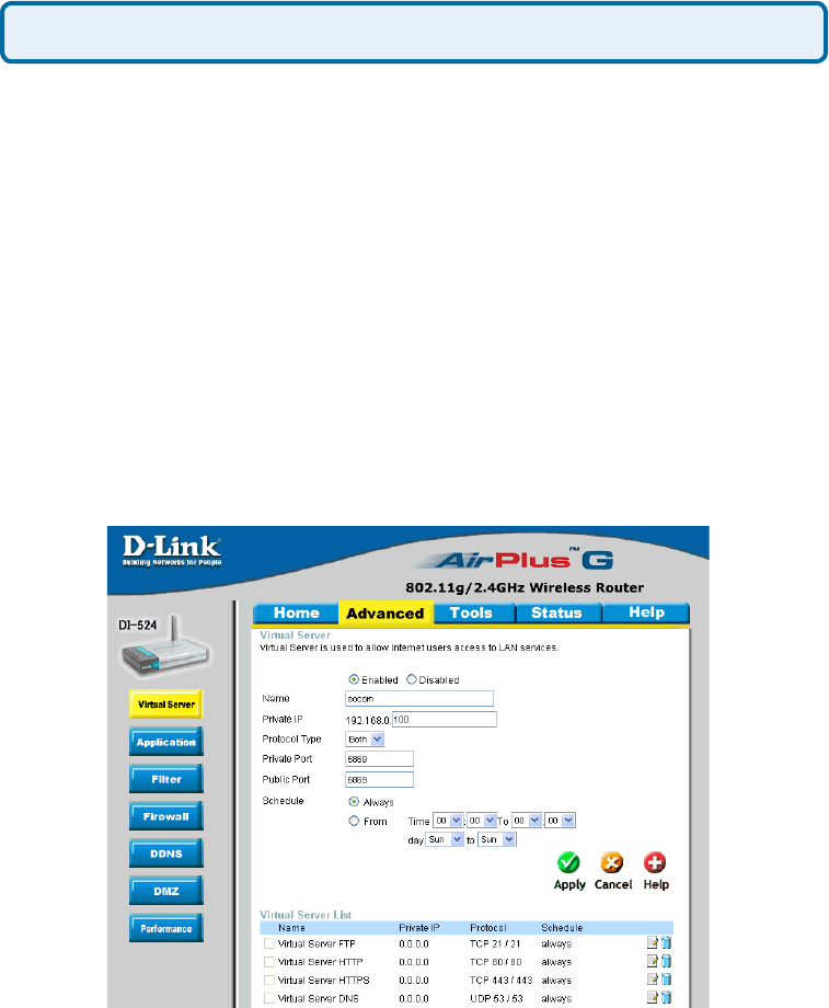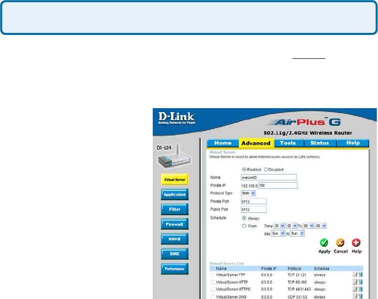 Step 4 You will now create a new Virtual Server entry. Click Enabled and enter a