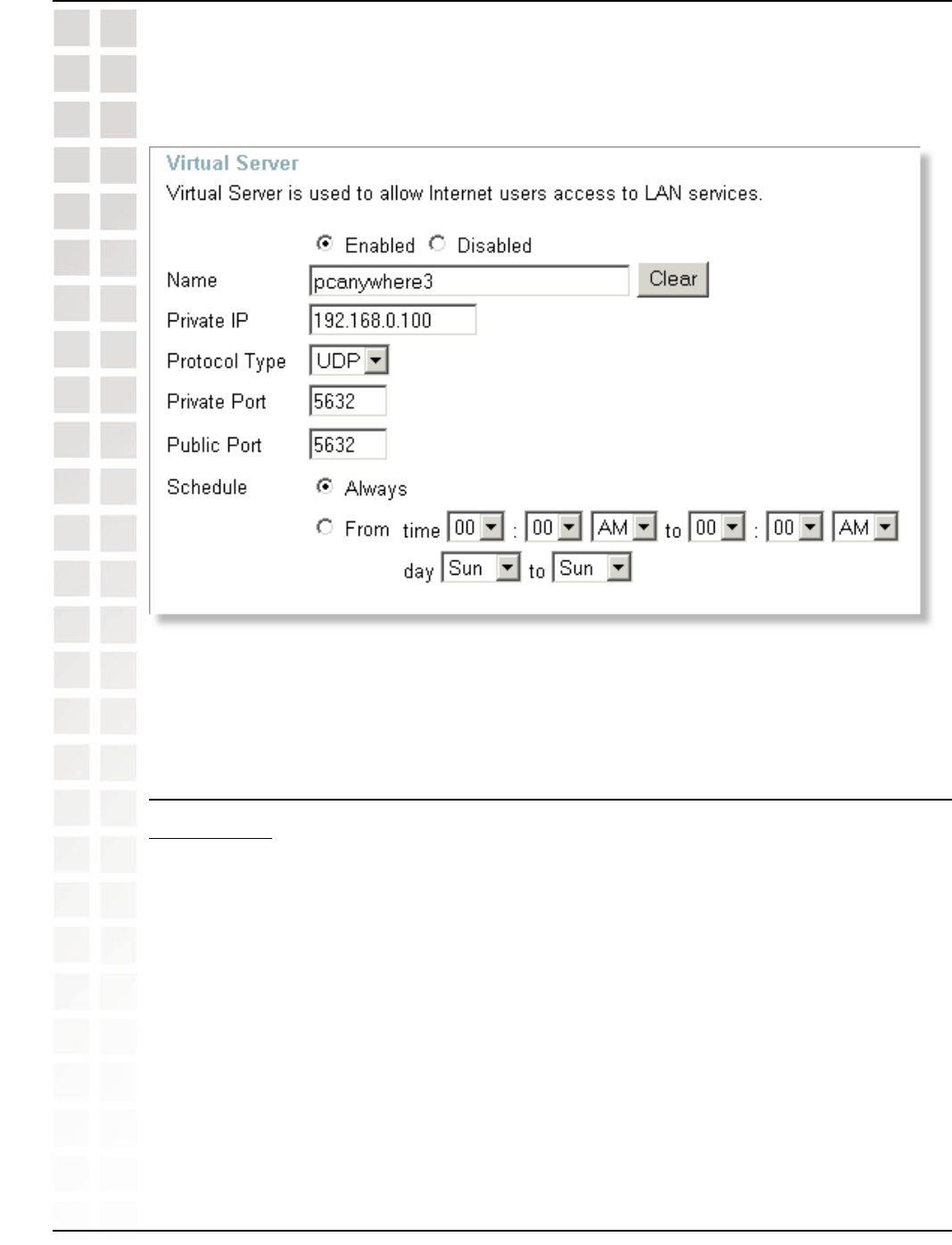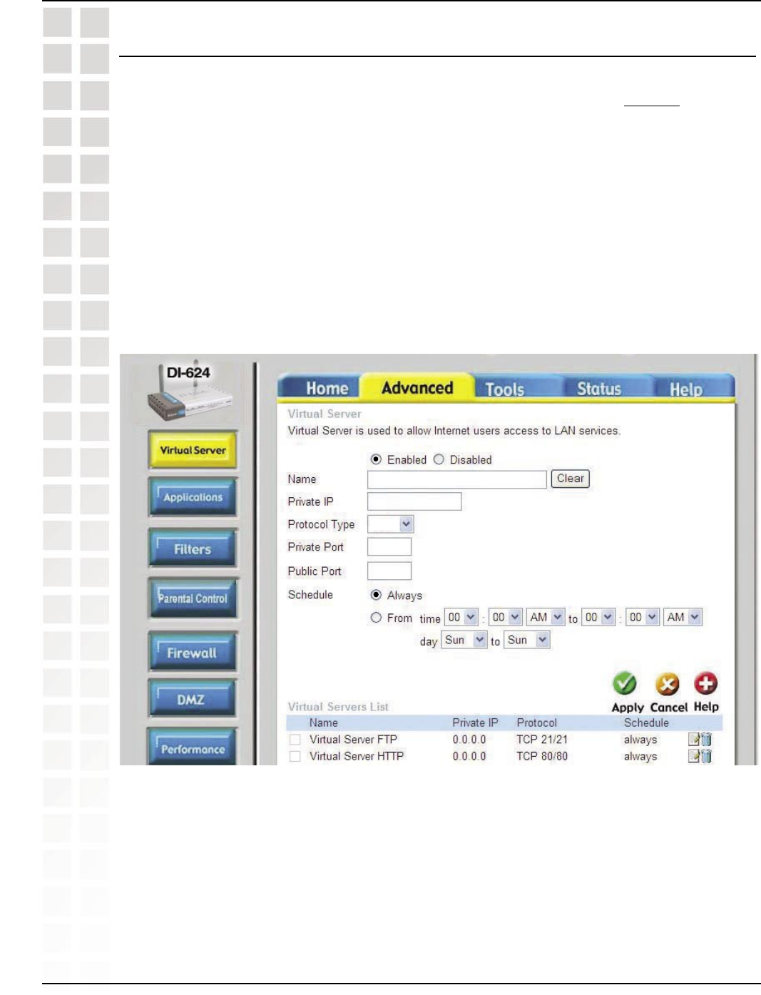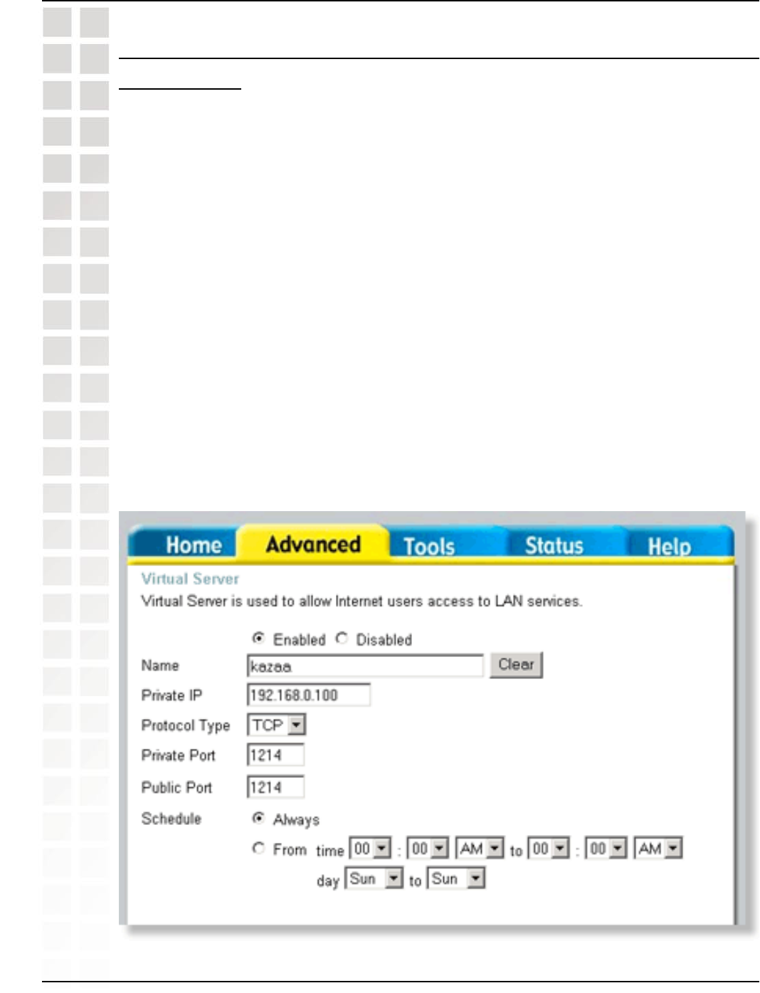 Step 4: You will now create a new Virtual Server entry. Click Enabled and enter a name
