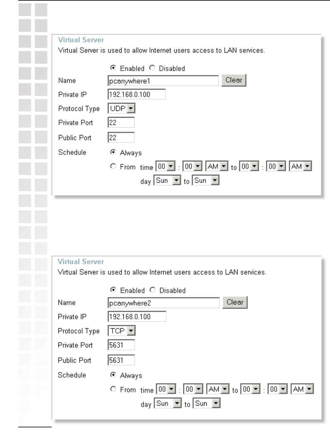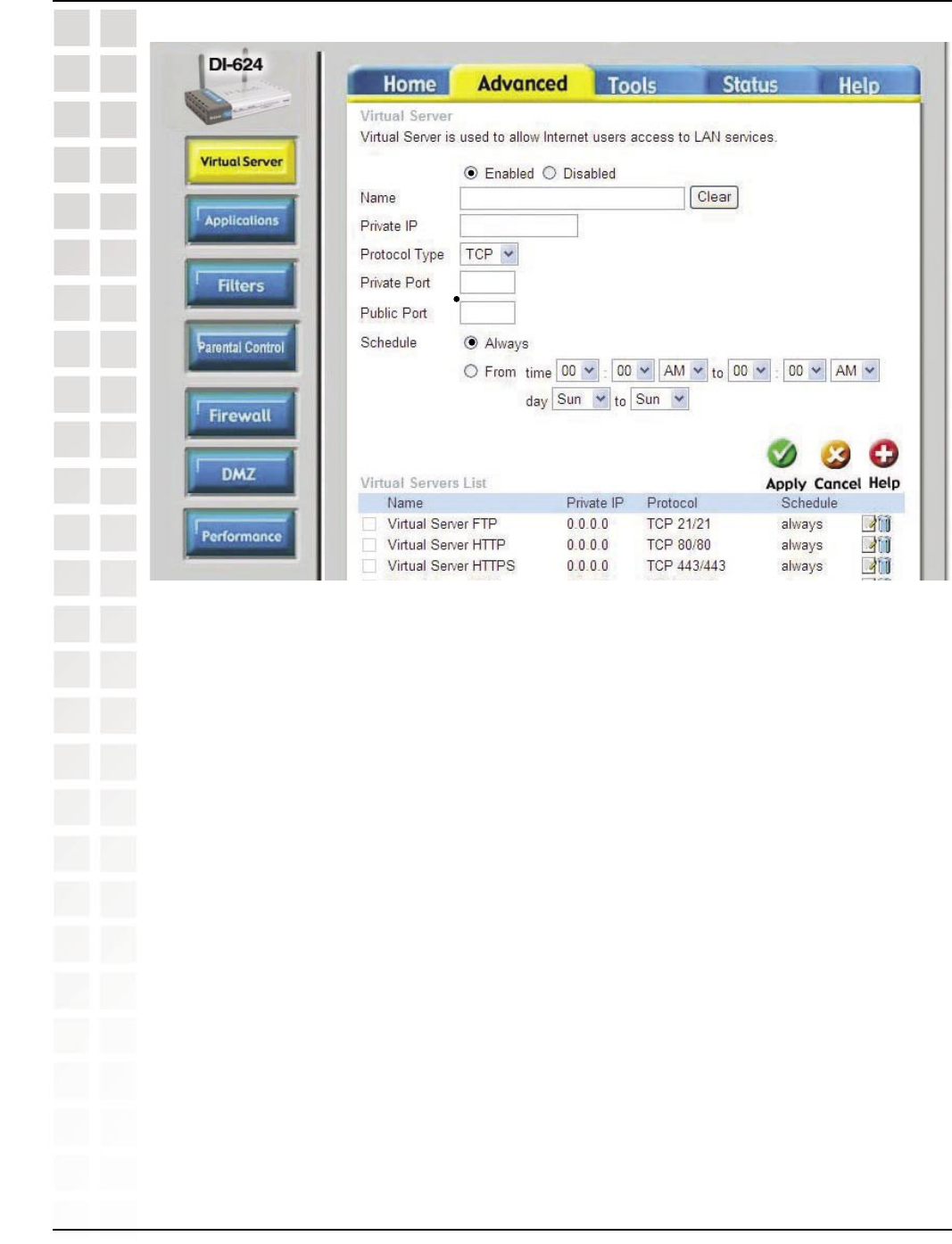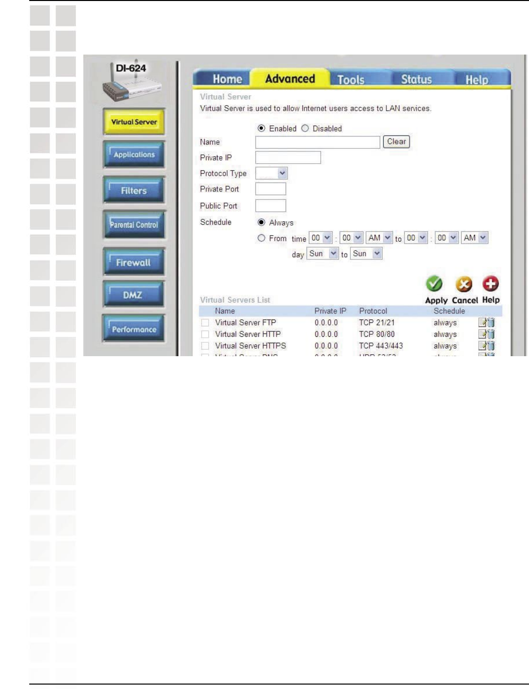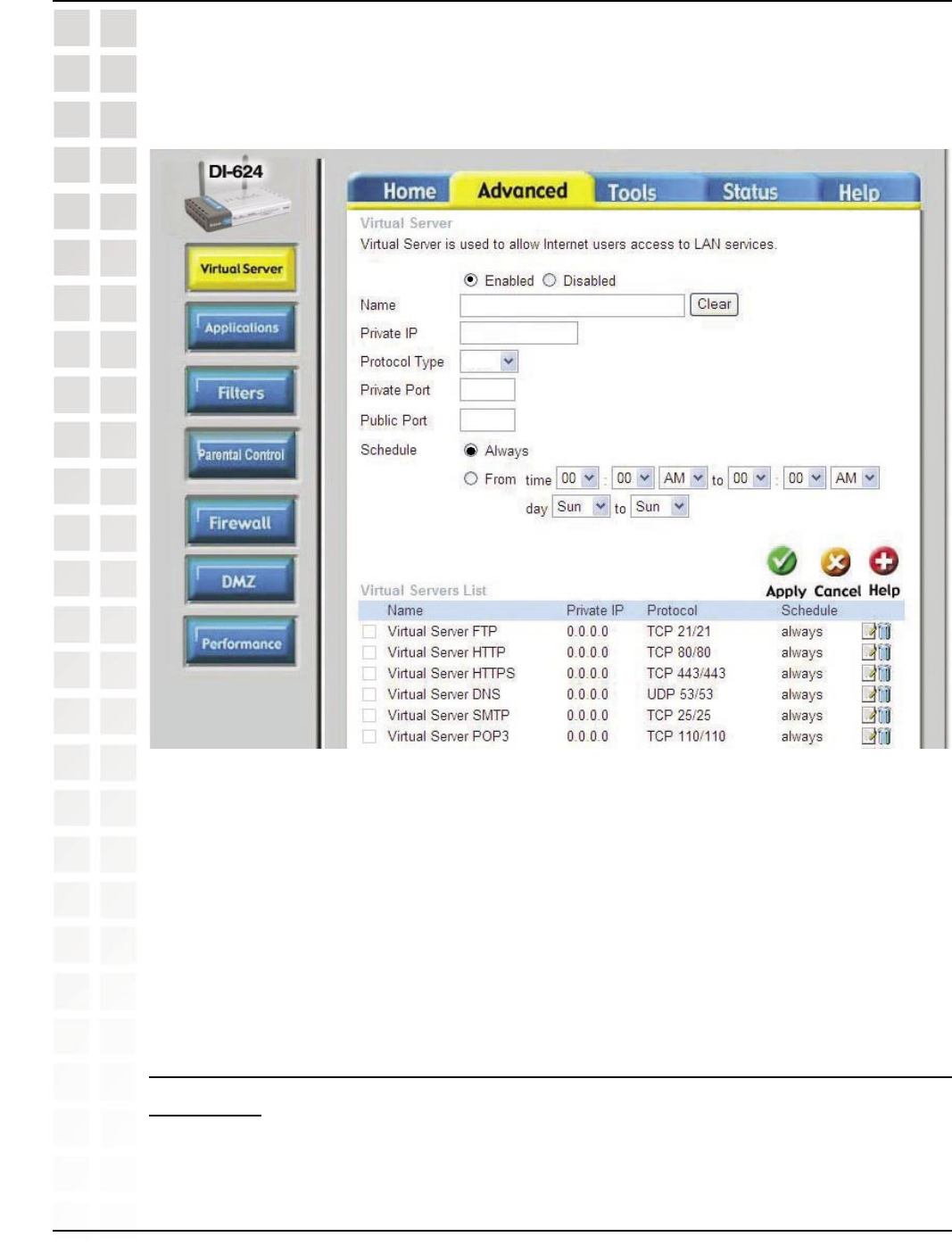 Step 4: You will now create a new Virtual Server entry. Click Enabled and enter a name