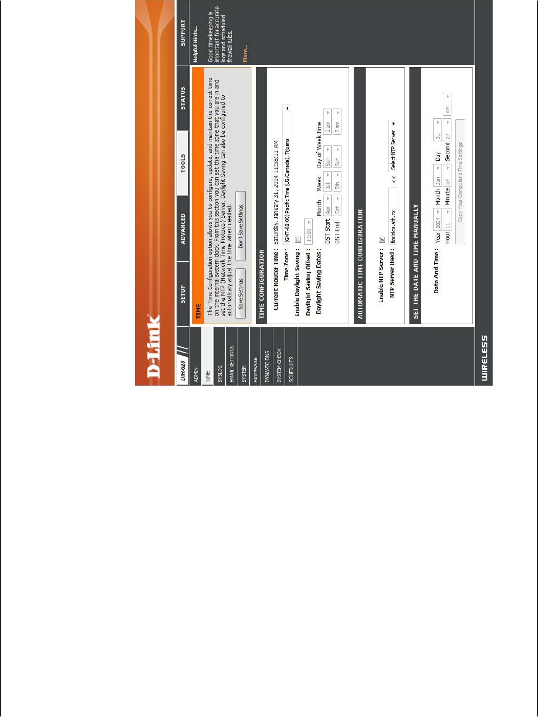 clock. From this section you can set the time zone that you are in and set the Time Server. Daylight Saving can also