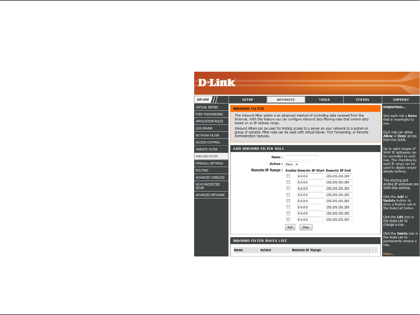 The Inbound Filter option is an advanced method of controlling data received from the Internet. With this feature you