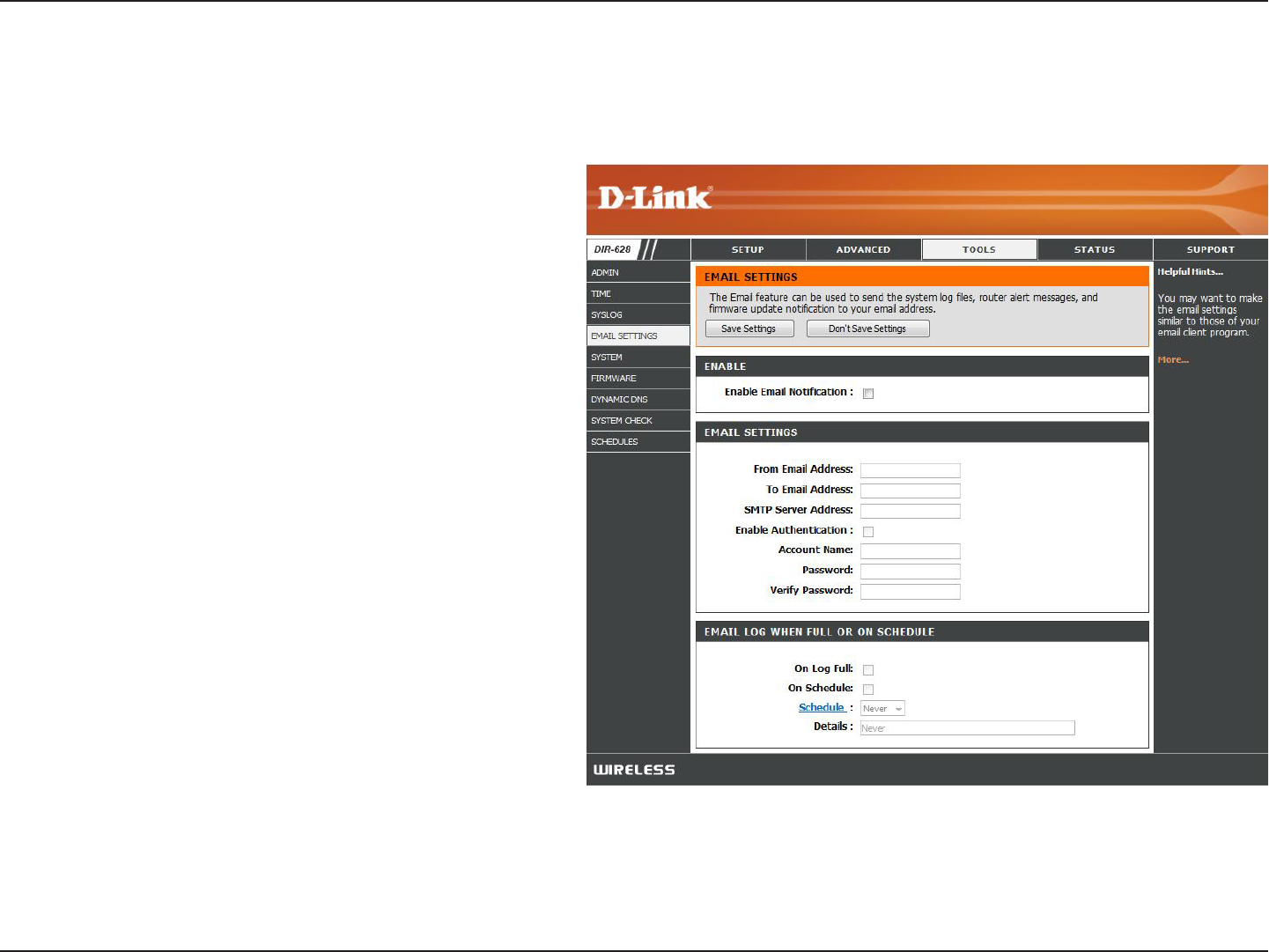 The Email feature can be used to send the system log files, router alert messages, and firmware update notification