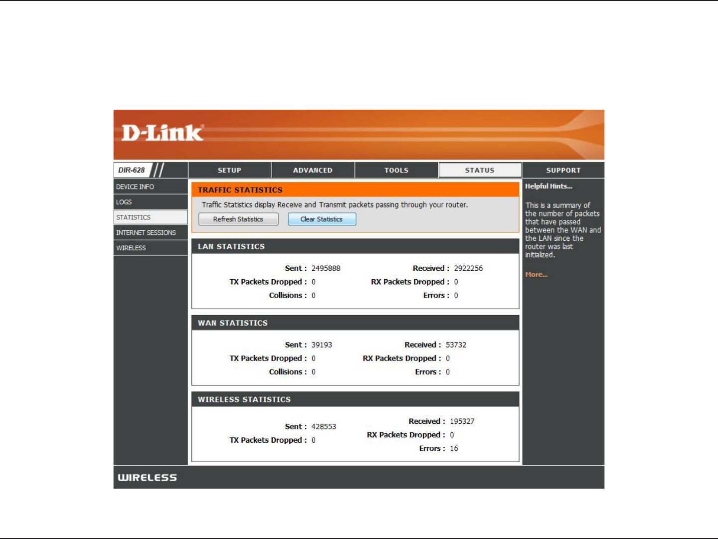 The screen below displays the Traffic Statistics. Here you can view the amount of packets that pass through the DIR-628 on