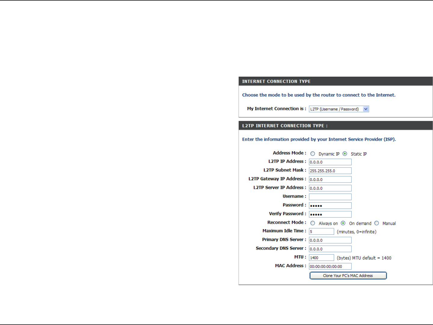 Choose L2TP (Layer 2 Tunneling Protocol) if your ISP uses a L2TP connection. Your ISP will provide you with a username