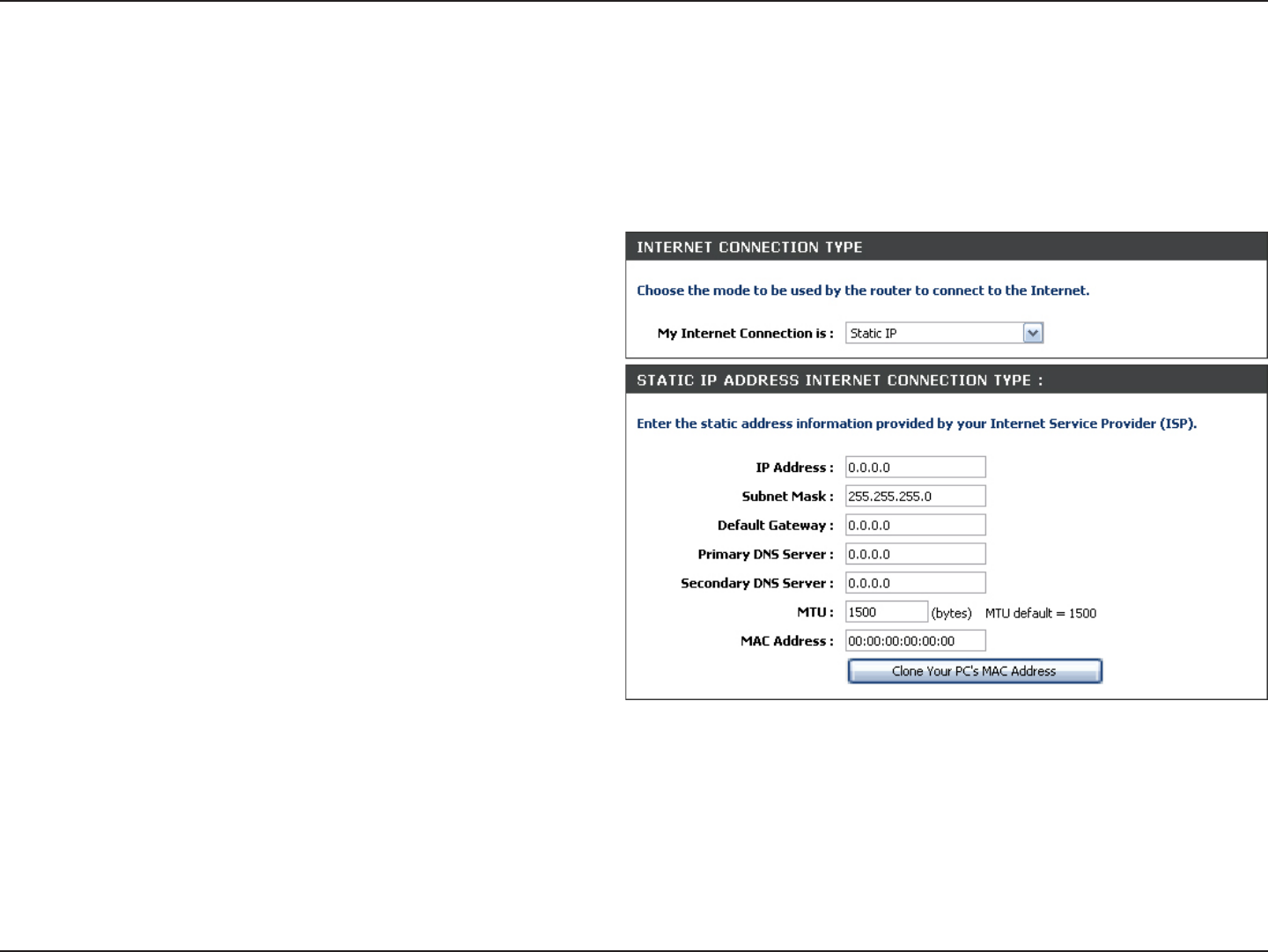 Select Static IP Address if all the Internet port’s IP information is provided to you by your ISP. You will need to enter in the IP address,