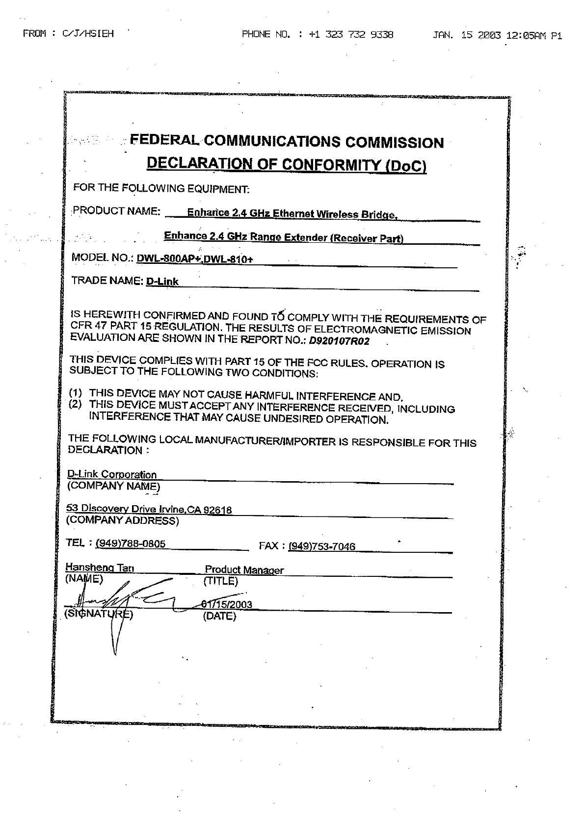 D Link Corporation Enhanced Ethernet Wireless Bridge/Range Extender scan 11 XDW