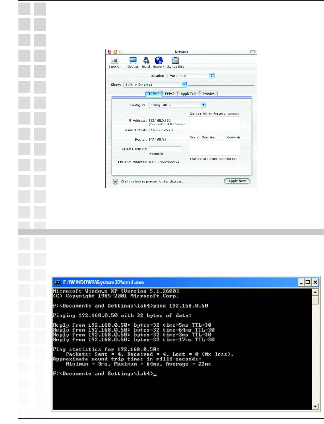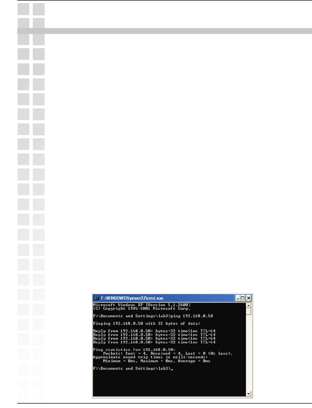 Start>Run>Type Command>Type ping 192.168.0.50. A successful ping will show