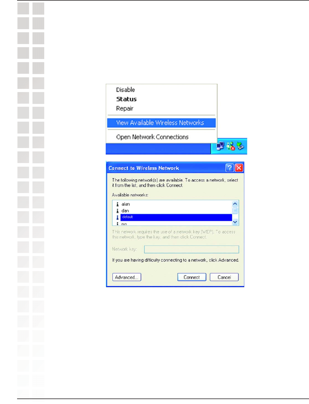 select View Available Wireless Networks. The Connect to Wireless Network screen